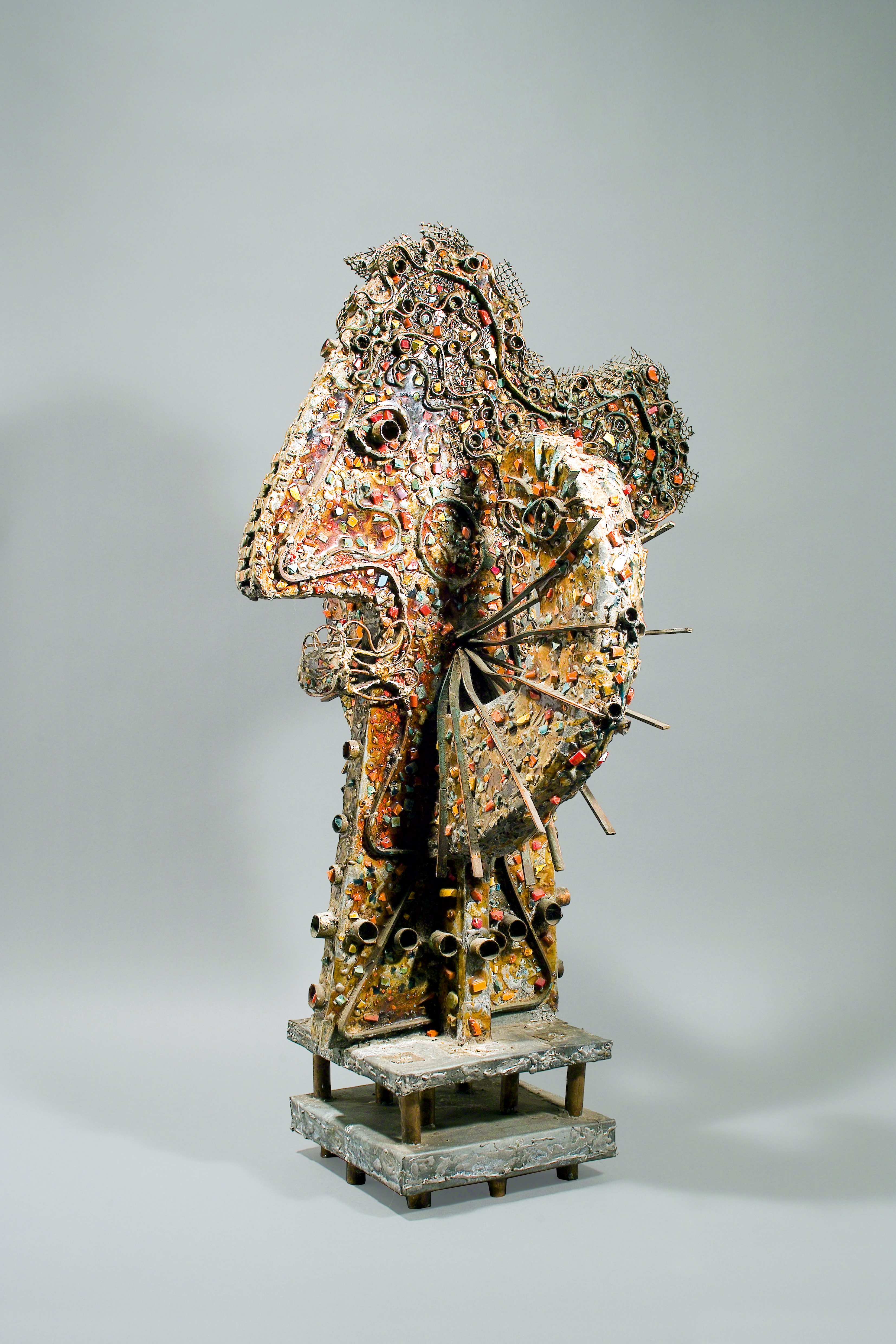 Neben Ton oder Terrakotta spielen in Christian Theunerts Bildhauerei der Gips und die Metallblechschweißerei eine nicht unwesentliche Rolle. Zwei Frauenköpfe sind bei dieser Plastik ineinander verarbeitet: ein rundliches Sonnengesicht und ein Kopf im Profil mit Dutt. Ein Spiel mit Perspektiven und Materialien, wobei er bei dieser Plastik zu bunten Mosaiksteinchen griff, die seine Gattin Ingerose Theunert - ebenfalls Künstlerin - gerne für ihre Werke verwendete.