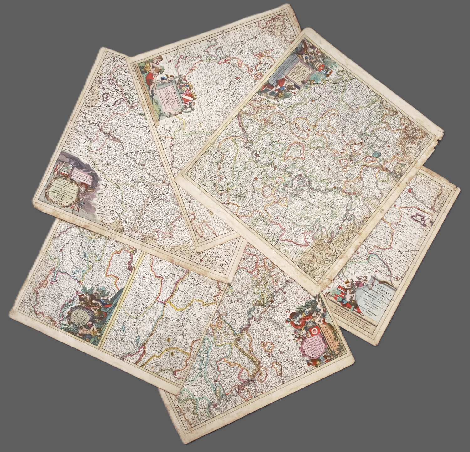 Danubii Fluvii. - XIII. Circuli austriaci in quo sunt archiducatus austriae ... - XIV. Circulus Bavarius in quo sunt ducatus Electoratus ... - XV. Rheni superioris Mosae et Mosellae. - XVI. Accuratissima Rheni inferiosis Mosae et Mosellae. - XVII. Landgraviatus alsatiae superioris et inferioris novissima tabula qua simul sundgovia Brisigovia et Ortenavia. - XVIII. Lotharingae et utribusque Alsatiae. - XIX. Electoratus et Palatinatus ad Rhenum. - XX. Circulus Franconius in quo sunt. - Und weitere. – Mit Mittelfalz. Papierbedingt gebräunt, etwas braun-, finger und vereinzelt feuchtfleckig, teilweise mit Randläsuren und teils hinterlegten Einrissen. Dekorativ.