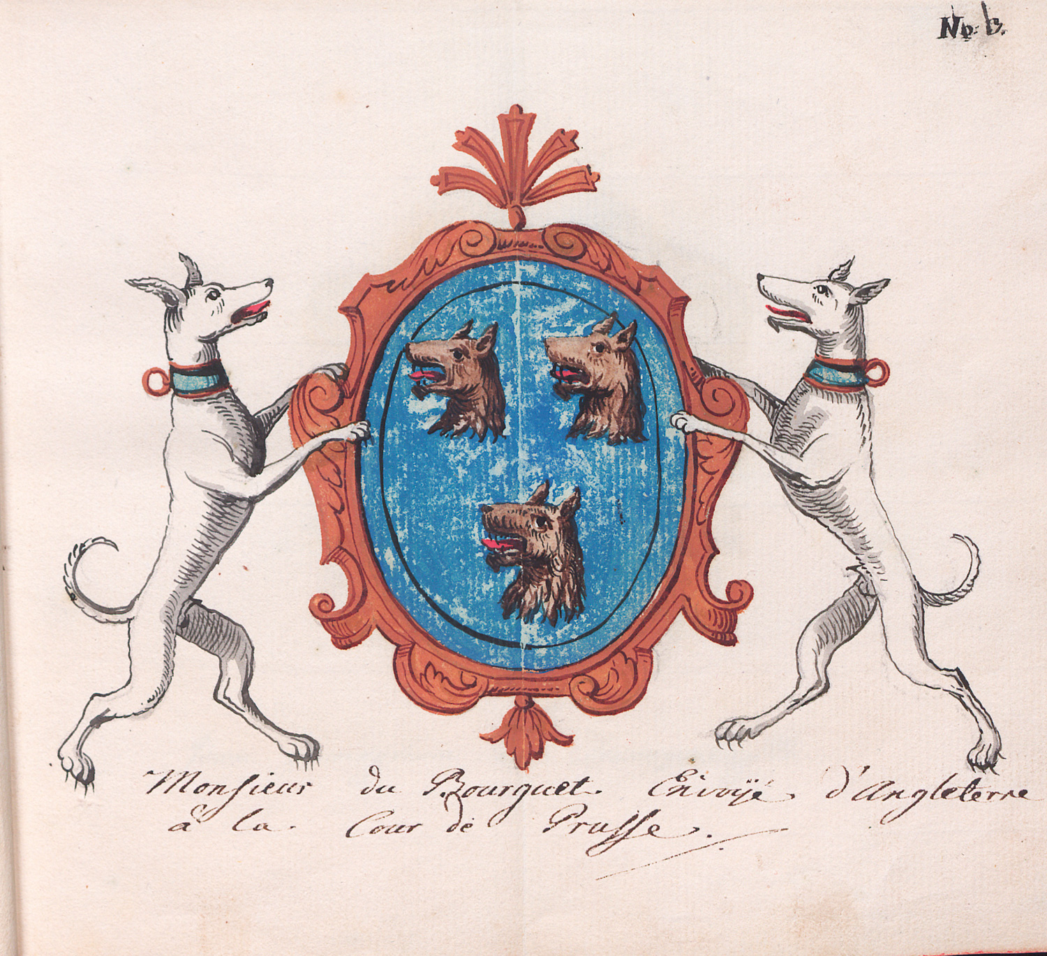 Am Anfang ein großes kaiserliches Wappen mit Krone, Einhorn, Greif und dem Orden vom Goldenen Vlies mit hs. Beischrift "Duc d'Espagne en Russie - Liria grand et Ambassadeur 1728". Enthalten sind auch englische und schottische Adelsgeschlechter "Angleterre", "Ecosse", "France" z. B. "Du Bourg Maréchal de France et Gouverneur de Straßbourg", "Hollande", "Gueldre" etc. – Nur vereinzelte kleine Oberflächenbereibungen, wenige Farbabplatzungen, fast durchgehend in bemerkenswert guter, frischer Qualität.