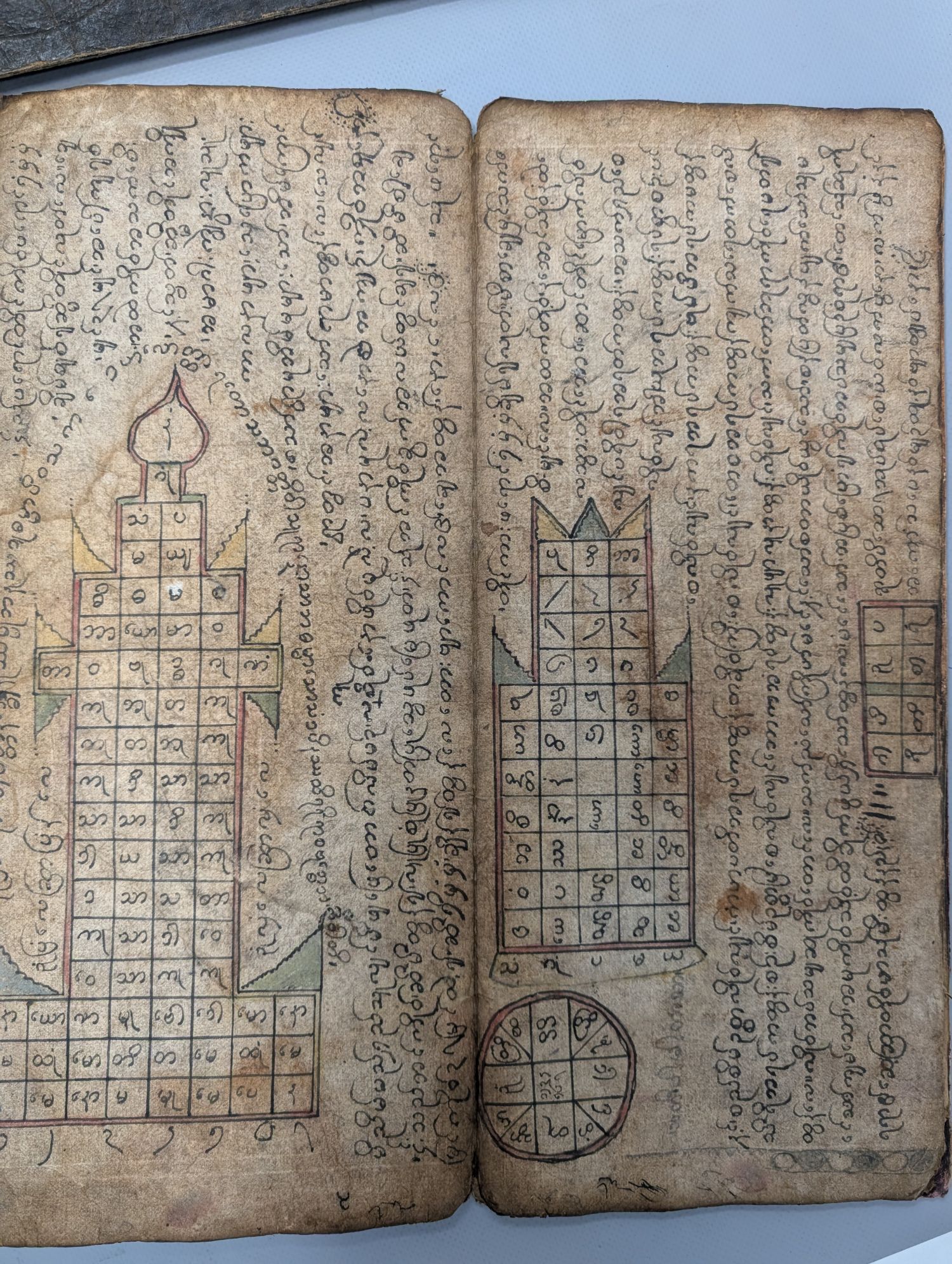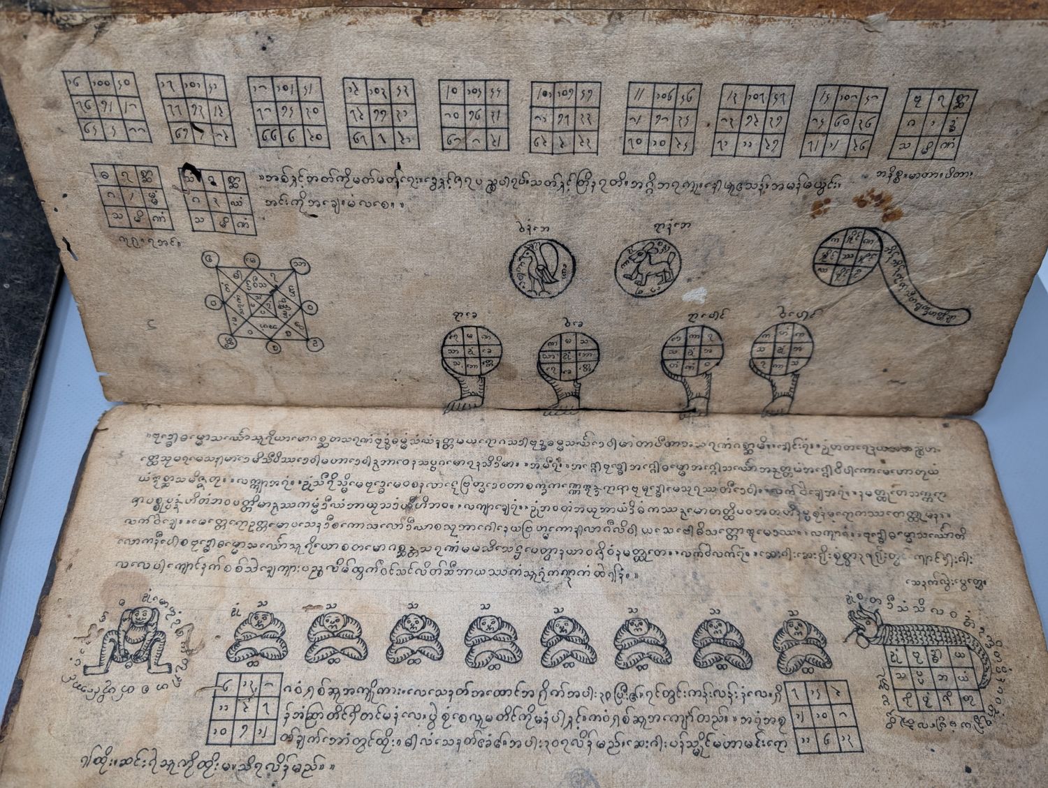 1) Schwarzes Parabaik, wohl ein astronomisches Parabaik. 20 Kompartimente 12 x 37 cm. Ausgefaltet 240 x 37 cm. Birmanische Abugida in Schwarz, Rot und Violett. Mit figurativen und geometrischen Tabellen, Zeichnungen in Feder, mit Rot und grauem Bleistift gehöht, Kämpfer und Tierkreiszeichen darstellend. Schwarz-dunkelbraune Khoi-Deckel.