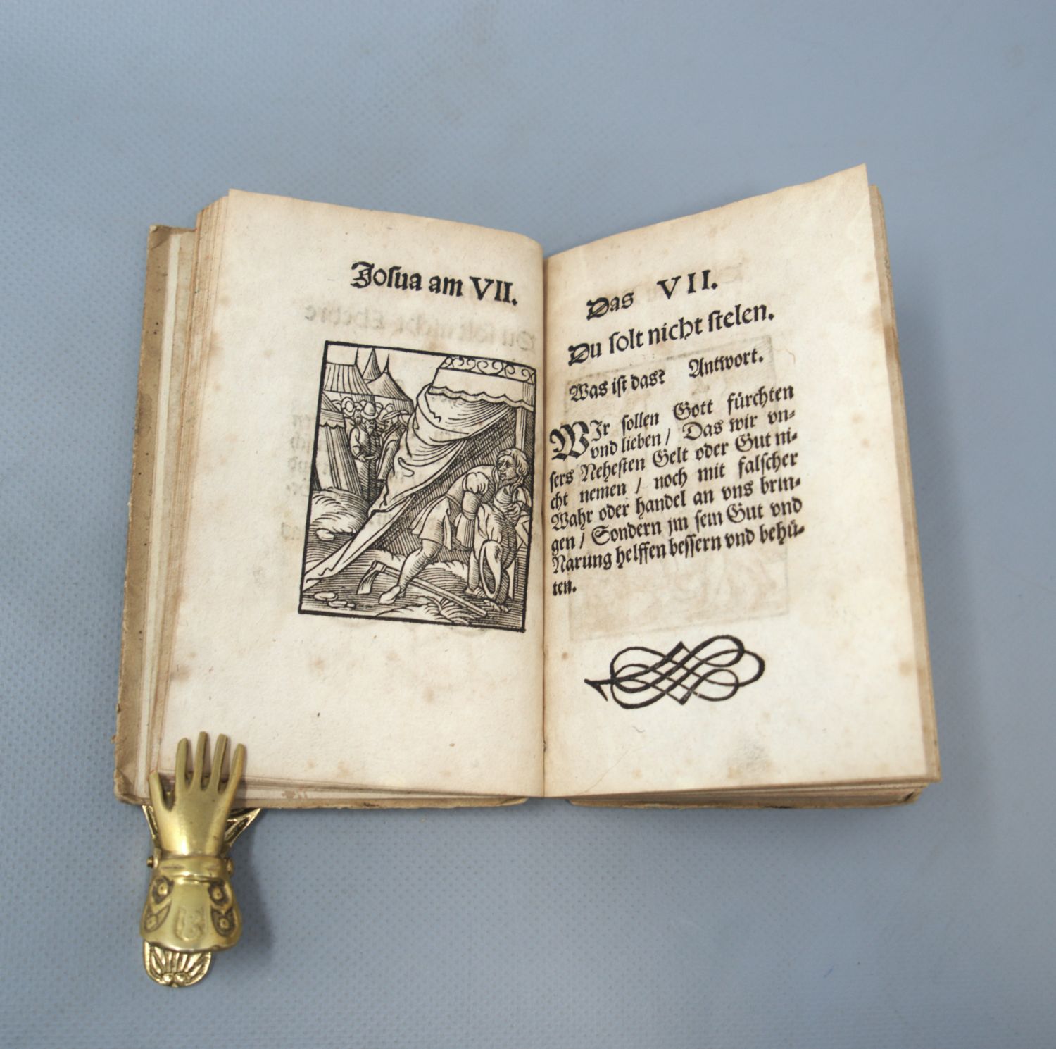 Luther, Martin. Enchiridion. Der kleine Catechismus für die gemeine Pfarrherr und Prediger. Auffs newe ubersehen und zugerichtet. 71 Bl. Titel in Schwarz und Rot. 71 Bl. (statt 72?). Mit Holzschnitt-Portraimedaillon und 25 nahezu ganzseitigen Textholzschnitten. 14,5 x 9,5 cm. Pappband des frühen 19. Jahrhunderts (stärker fleckig und berieben, Ecken bestoßen, Rückenbezug mt Fehlstelle). Wittenberg, o. Dr. u. J. (um 1560).