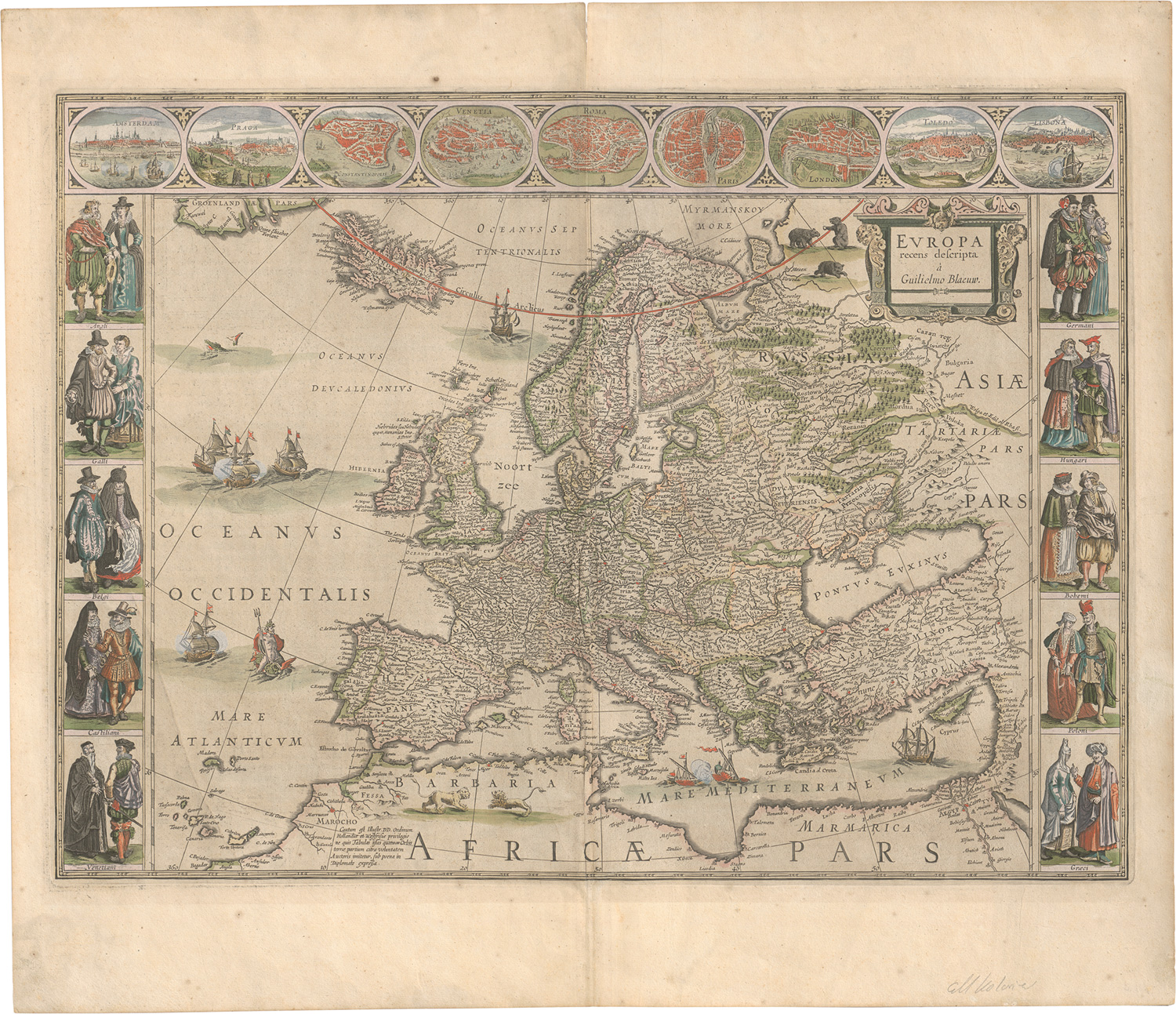 Verso mit lateinischem Text. Die Europakarte stammt aus Blaeu's 'Theatrum orbis terrarum'. Die 19 Randansichten zeigen zum einen rechts und links neben der Karte zehn Trachtendarstellungen verschiedener Länder, oberhalb mit neun Stadtansichten von Amsterdam, Prag, Istanbul, Venedig, Rom, Paris, London, Toledo und Lissabon. – Mit Mittelfalz, etwas fleckig und mit kleinem Einriss. Dekorativ.