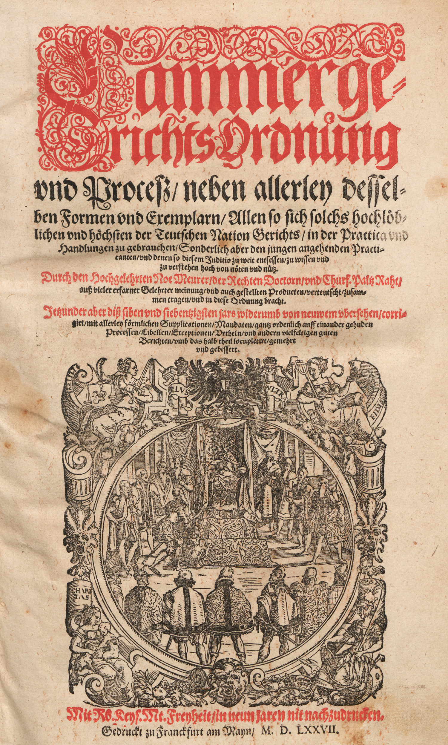 Meurer, Noe. Cammergerichts Ordnung und Proceß, neben allerley deßselben Formen und Exemplarn. Von neuwem ubersehen, corrigirt, gemehrt und gebessert. Mit Holzschnitt-Titelvignette und Druckermarke am Schluß. 14 nn., 242 röm. num., 1 (von 2 ) Bl. 31 x 19,5 cm. Blindgeprägtes Schweinsleder d. Z. (fleckig, etwas berieben) mit 2 (von 4) intakten Bindebändern. Frankfurt, (J. Schmidt für S. und J. Feyerabend), 1577.