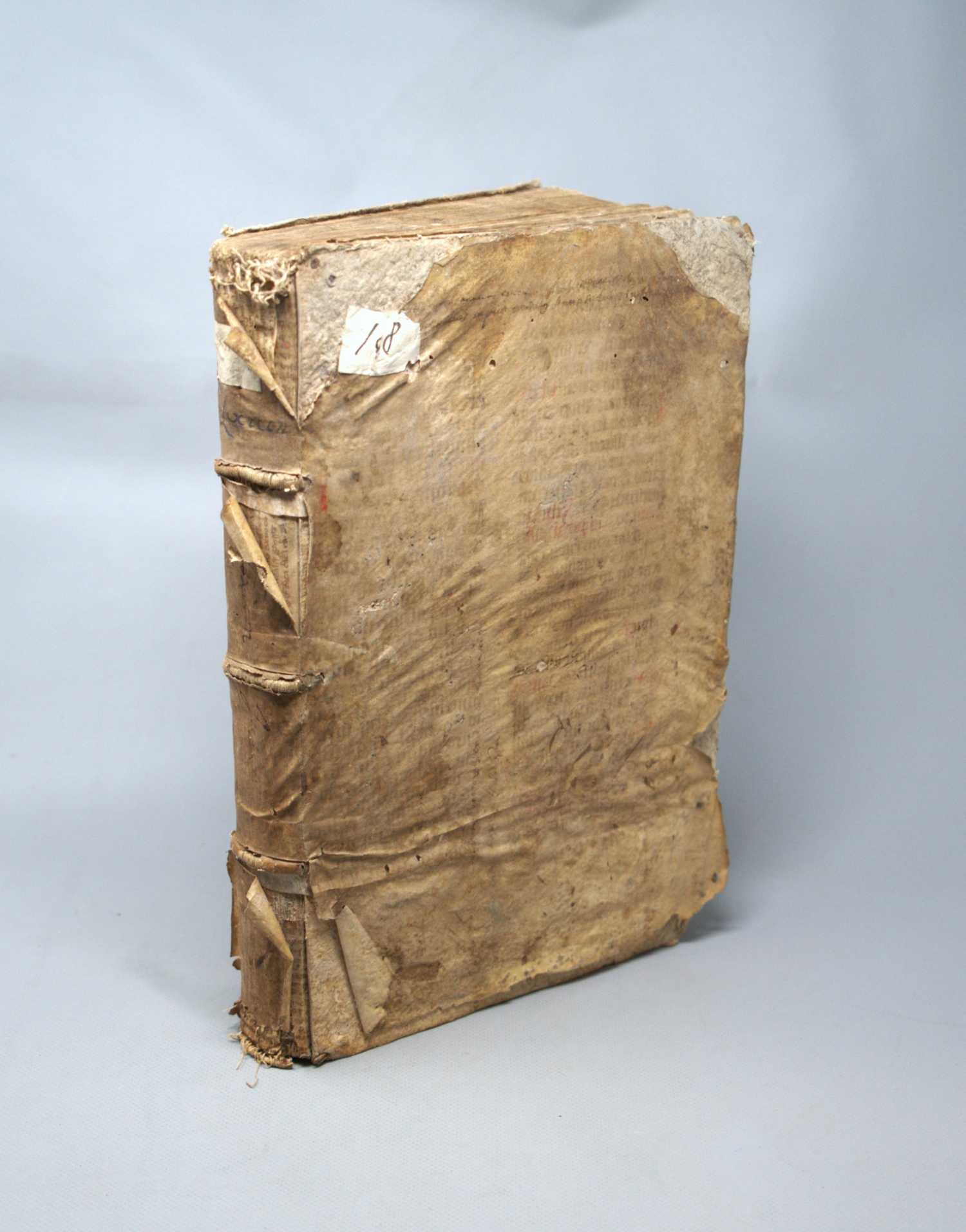 Spiegel, Jakob. Lexicon iuris civilis. Ex varijs probatorum autorum commentarijs congestum. Postremò nunc ab ipso autore recognitum, ac locupletatum. 1120 Sp., 2 S. Mit Holzschnitt-Druckermarke auf dem Titel. 33 x 21 cm. Lädiertes Pergament des 17. Jahrhunderts (unter Verwendung eines Handschriftenblattes, abgerieben, mit großen Fehlstellen im Bezug, stark bestoßen). Lyon, Sebastian Gryphius, 1552.