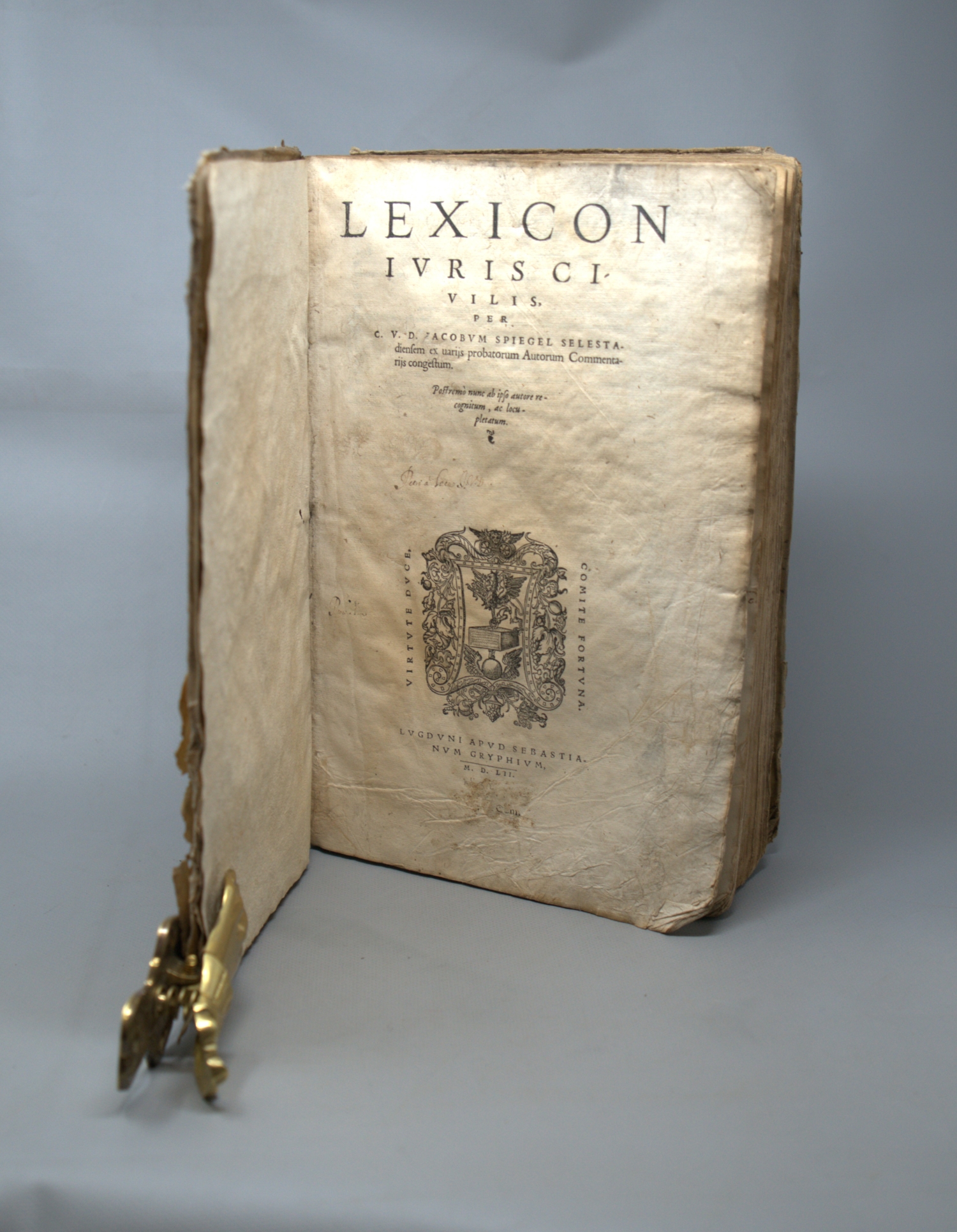 Baudrier VIII, 261. EROMM 20140917. – Hübsche Lyonneser Ausgabe des gefeierten, erstmals 1538 erschienenen Hauptwerks aus der Feder des kaiserlichen Geheimsekretärs, des Rechtswissenschaftlers und Humanisten Jakob Spiegel (1483-1547), der aus Schlettstadt stammt. "Durch den unerwarteten Tod des Kaisers Maximilian (Januar 1519) seiner Stellung enthoben, brachte Spiegel die nächsten Monate in seiner Vaterstadt Schlettstadt zu, indem er sich einer umfassenden schriftstellerischen Thätigkeit widmete und zugleich an den freundschaftlichen Versammlungen der von Wimpfeling gegründeten Schlettstadter Gelehrten Gesellschaft mit Eifer sich betheiligte. So führte er die schon im Jahre 1516 auf Maximilian's specielle Anregung unternommenen kritisch-exegetischen Arbeiten zur Austrias des Riccardus Bartholinus weiter (erschien erst 1531 bei Johannes Schott in Straßburg: 'Richardi Bartholini Perusini Austriados Lib. XII. Maximiliano Augusto dicati cum scholiis Jacobi Spiegelij Selesten'; so entstanden um diese Zeit jene compilatorischen Vorarbeiten, aus denen etwa 20 Jahre später sein juristisches Hauptwerk, das 'Lexicon iuris civilis', erwuchs" (ADB XXXV, 156-158). – Wenige hs. Adnotationen, vielfache Knicke, gelegentliche Papierläsuren, ausgebunden und eselsohrig, etwas stärker gebäunt, fleckig und wasserrandig, fleckig und unfrisch, stellenweise stärkere Sporflecken.