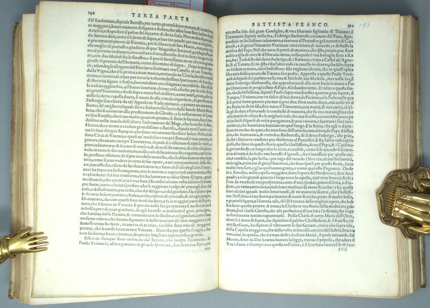 Vorliegt hier des dritten Bandes zweiter und letzter Teil, der bedeutendste des Werkes, der die Viten und Porträts enthält von Domenico Baccio Bandinelli, Bassano, Beccafumi, Girolamo da Carpi, Giacopo da Pontormo, Francesco Primaticcio, Francesco Salviati, Giacopo Sansovino, Giovannantonio Sodoma, Taddeo Zucchero, aber vor allem die Viten der beiden bedeutensten Künstler Italiens im 16. Jahrhundert: Die Vita Tiziano Vecellio und die allein 82 Seiten umfassende und damit umfangreichste und erste Künstlerbiographie Michelangelo Buonarrotis. Auch seine eigene Lebensbeschreibung brachte Vasari in diesem Band unter: "Descrizione dell'opere di Giorgio Vasari, pittore, & architetto aretino". – Mit der Namenskorrektur des Verlages von "Girolamo Genga", zwei winzige alte Stegverstärkungen und kleinem Wurmgang im breiten Rand der letzten Lagen, sonst kaum Wurmspuren, Läsuren oder Flecke, insgesamt sehr schönes Exemplar in zeitgenössischem Einband.