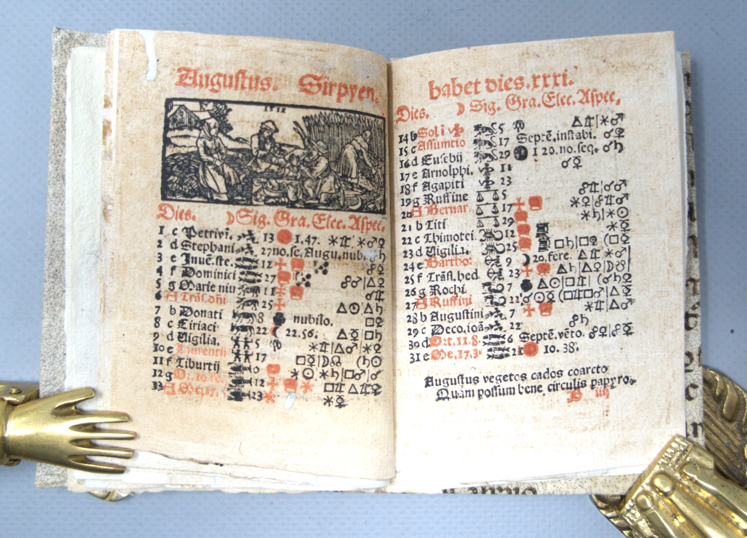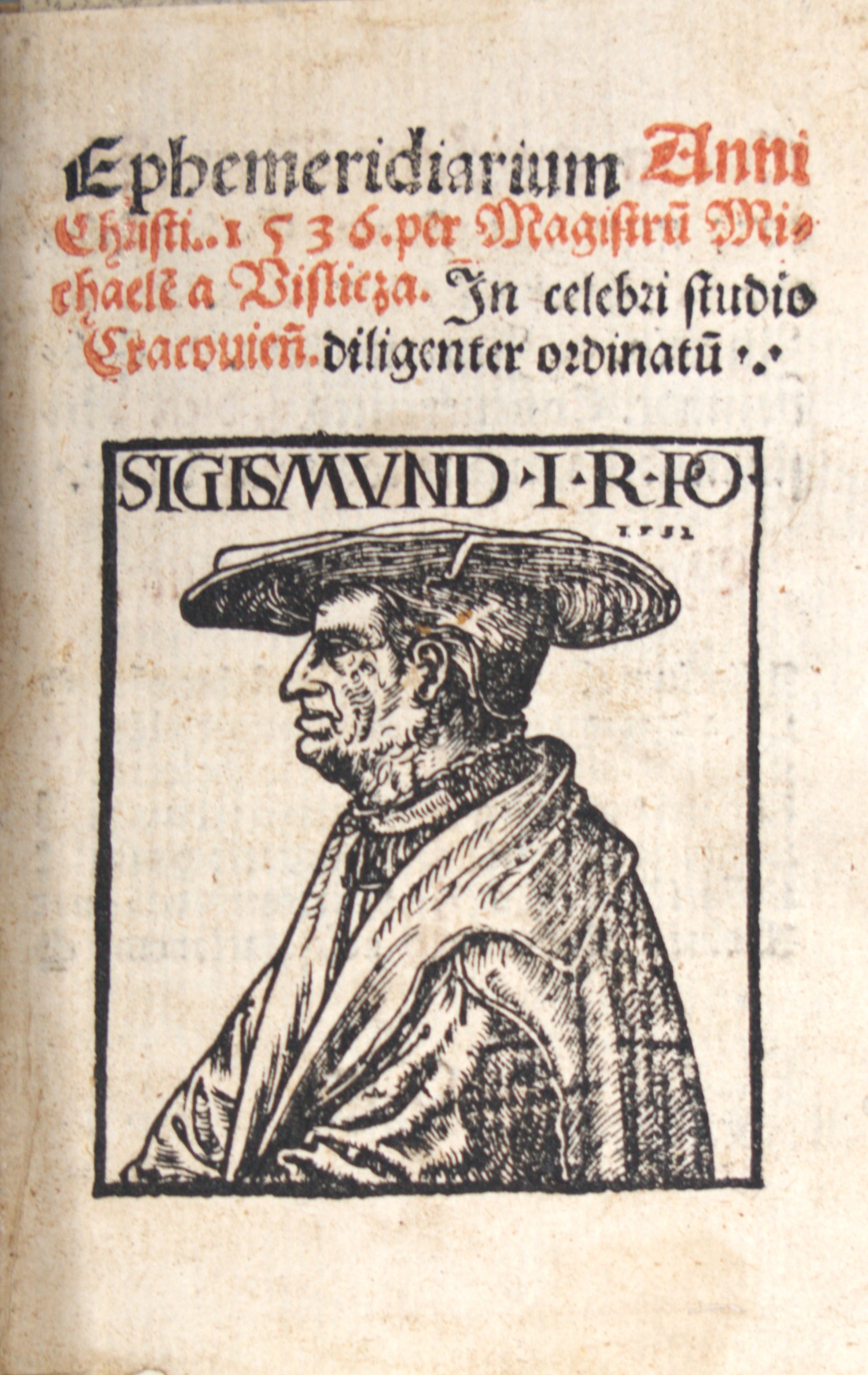 Vislicza, Michael de (Michal z Wiślicy). Ephemeridiarium Anni Christi 1536. per Magistrum Michaelem a Visticza. In celebri studio Cracoviense diligentia ordinatum. 16 nn. Bl. Mit großer Holzschnitt-Titelvignette und 12 Textholzschnitten. Ca. 11 x 7,5 cm. Moderner Pergamentband unter Verwendung eines Handschriftenfragment des 13. Jahrhunderts. (Krakau, Matthias Scharffenberg, 1536 [i. e. 1535]).