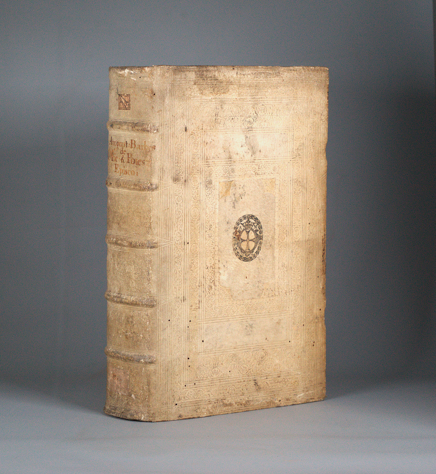 Barbosa, Agostinho. Pastoralis solicitudinis, sive de officio, et potestate episcopi, tripartita descriptio. Nunc ultimùm ab ipso auctore recognita, variis resolutionibus exornata, & multis Doctorum citationibus, aliisque accessionibus illustrata. 2 Teile in 1 Band. 16 Bl., 478 S., 55 Bl.; 611, 124 S., 2 Bl. Titel in Schwarz und Rot. Mit großer gestochener Druckermarke auf dem Titel (in Teil II als Holzschnitt wiederholt). 34,5 x 21,5 cm. Blindgeprägter Schweinslederband d. Z. (etwas fleckig und berieben; ohne Schließen) und Wappensupralibros mit den Initialen "AM" auf dem VDeckel. Lyon, Borde, Arnaud et al., 1665.