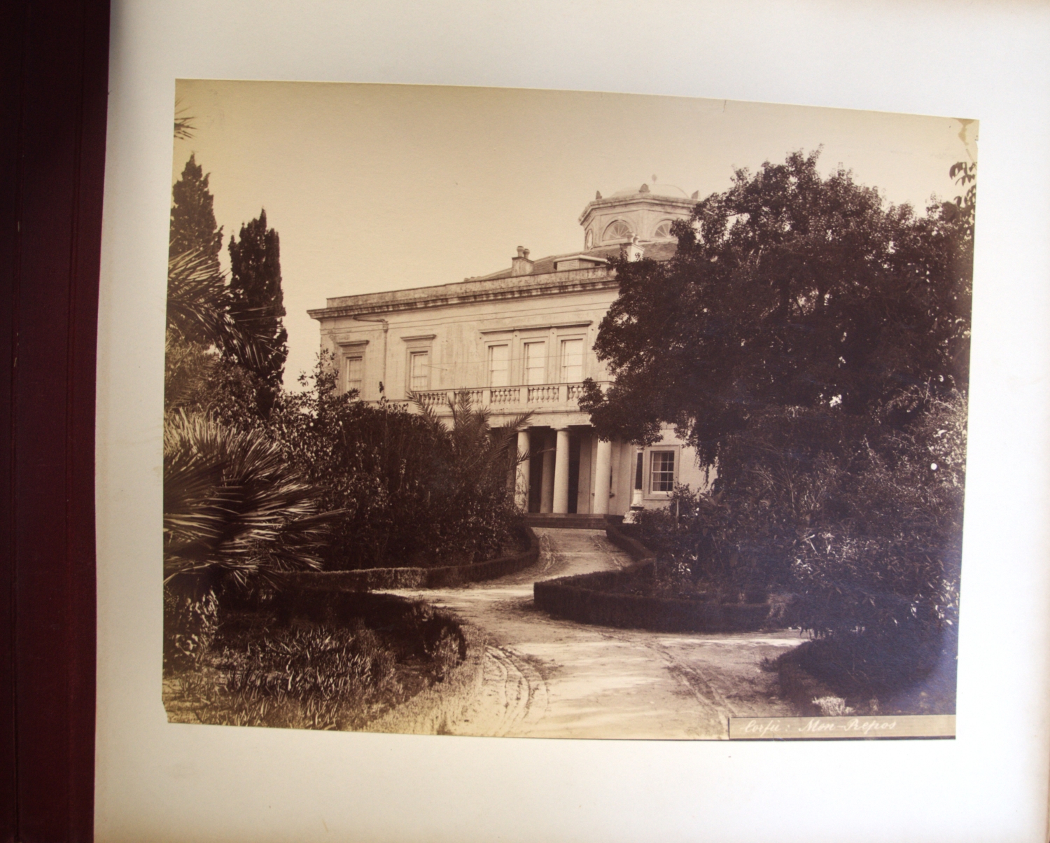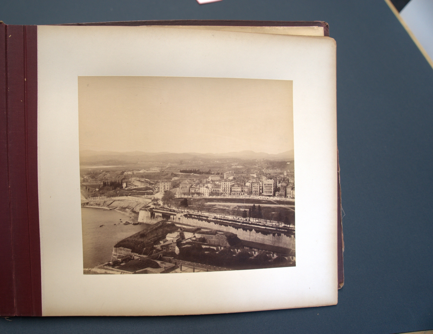 Schönes Souveniralbum mit zwölf größeren Ansichten (Format: ca. 21,5 x 24,5 cm) des Hauptortes Kerkyra und seines Hafens, Schloss Mon Repos auf der Kanoni-Halbinsel, der Siedlung Potamos ("Fotografia B. Rorri"), ferner von der vorgelagerten Insel Pontikonissi, Paliokastro etc. Am Schluss mit drei Darstellungen lokaler Bewohner in der traditionellen Inseltracht, diese im kleineren Format (ca. 13,5 x 9,5 cm). Auf dem fl. Vorsatz aus Seidenmoiree in Golddruck "Weihnachten E. R. 1889" – Die Photos teils etwas berieben.