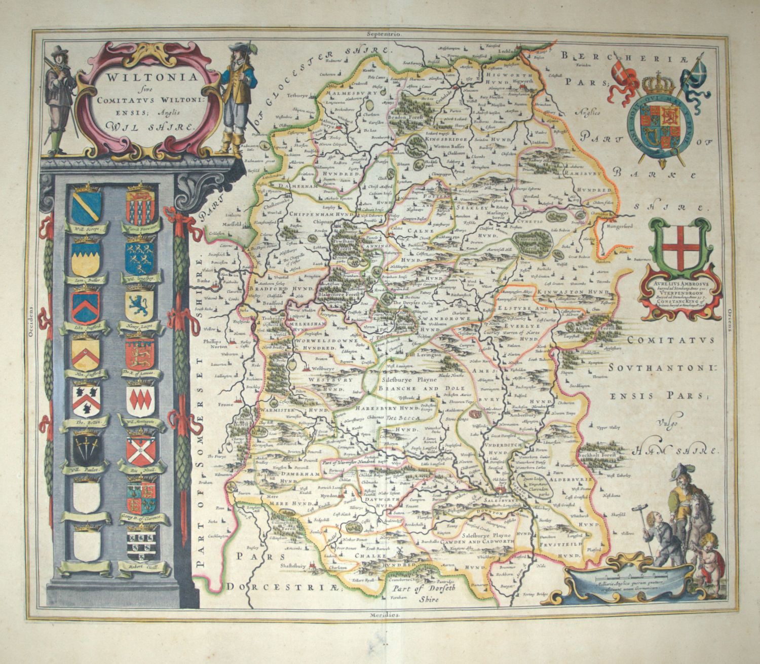 Vorhanden sind: I. Willem und Joan Blaeu. Ager parisiensis vulgo l'isle de France. Grenzkoloriert. Amsterdam 1640. - II. Dieselben. Wiltonia sive Comitatus Wiltoniensis Anglis Wil Shire. Grenzkoloriert. 1659. - III. Georg Braun und Franz Hogenberg. Lutetia vulgari nomine Paris urbs Galliae. Köln 1572. - IV. James Duncan and William Ebden. New Map of the County of Wiltshire. Grenz- und flächenkoloriert. 1811. - V. Johann Baptist Homann. Regionis quae est circa Londinum specialis repraesentatio. Mit Grenz- und Flächenkolorit. Nürnberg 1741. - VI. Johannes Janssonius. Principatus Walliae pars borealis vulgo north Wases. Grenzkoloriert. Amsterdam 1646. - VII. London. Stadtplan. Um 1700. - VIII. Matthaeus Merian. Portugallia et Algarbia quae olim Lusitania. Koloriert. 1646. - IX. Peter Schenk. Somersettensis Comitatus. Somerset Shire. Grenzkoloriert. Amsterdam um 1700. – Meist mit Mittelfalz, teilweise mit kleineren und größeren Gebrauchsspuren, leicht gebräunt am Rand und manchmal mit Randläsuren oder hinterlegten Einrissen. Insgesamt dekorativ.