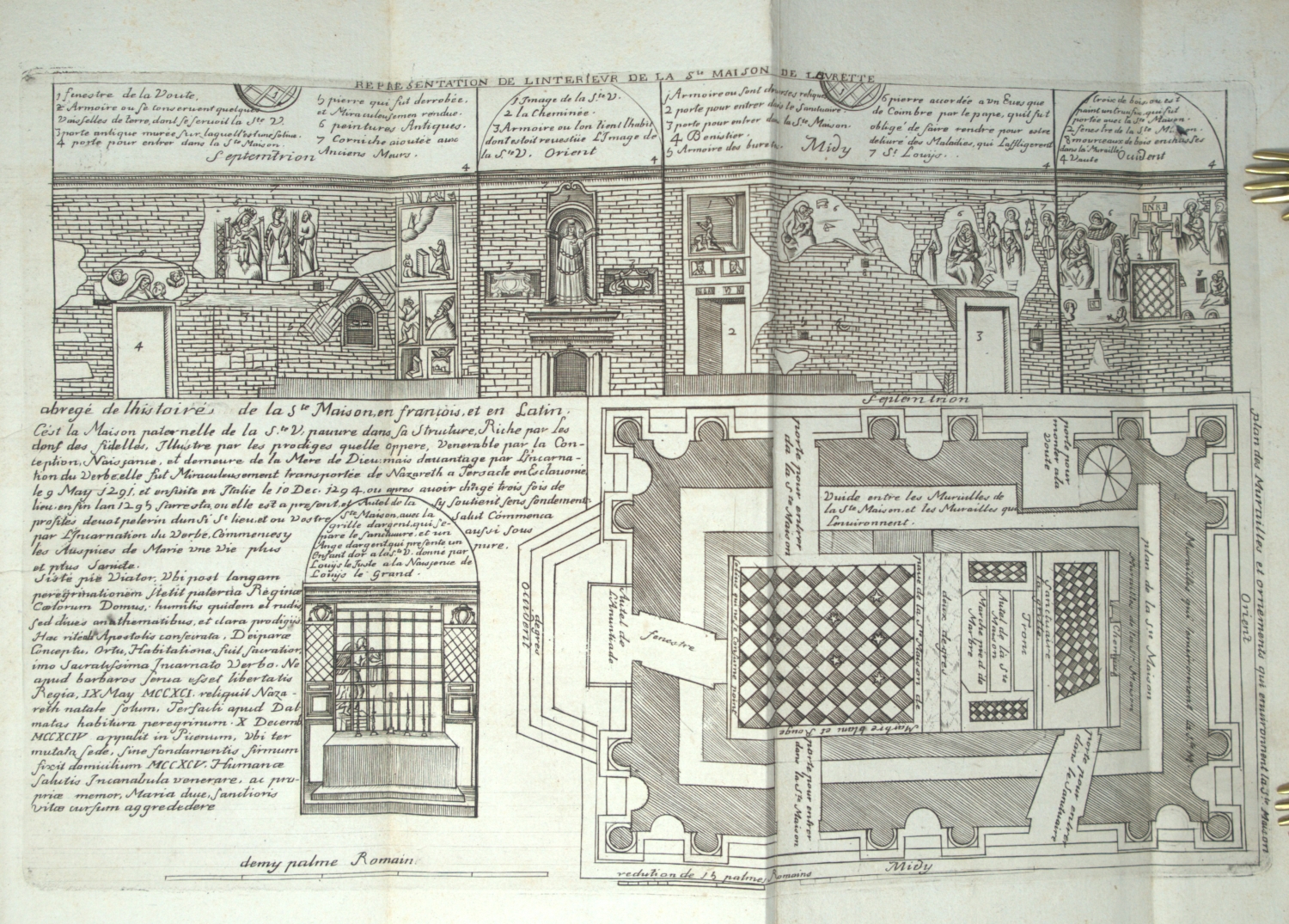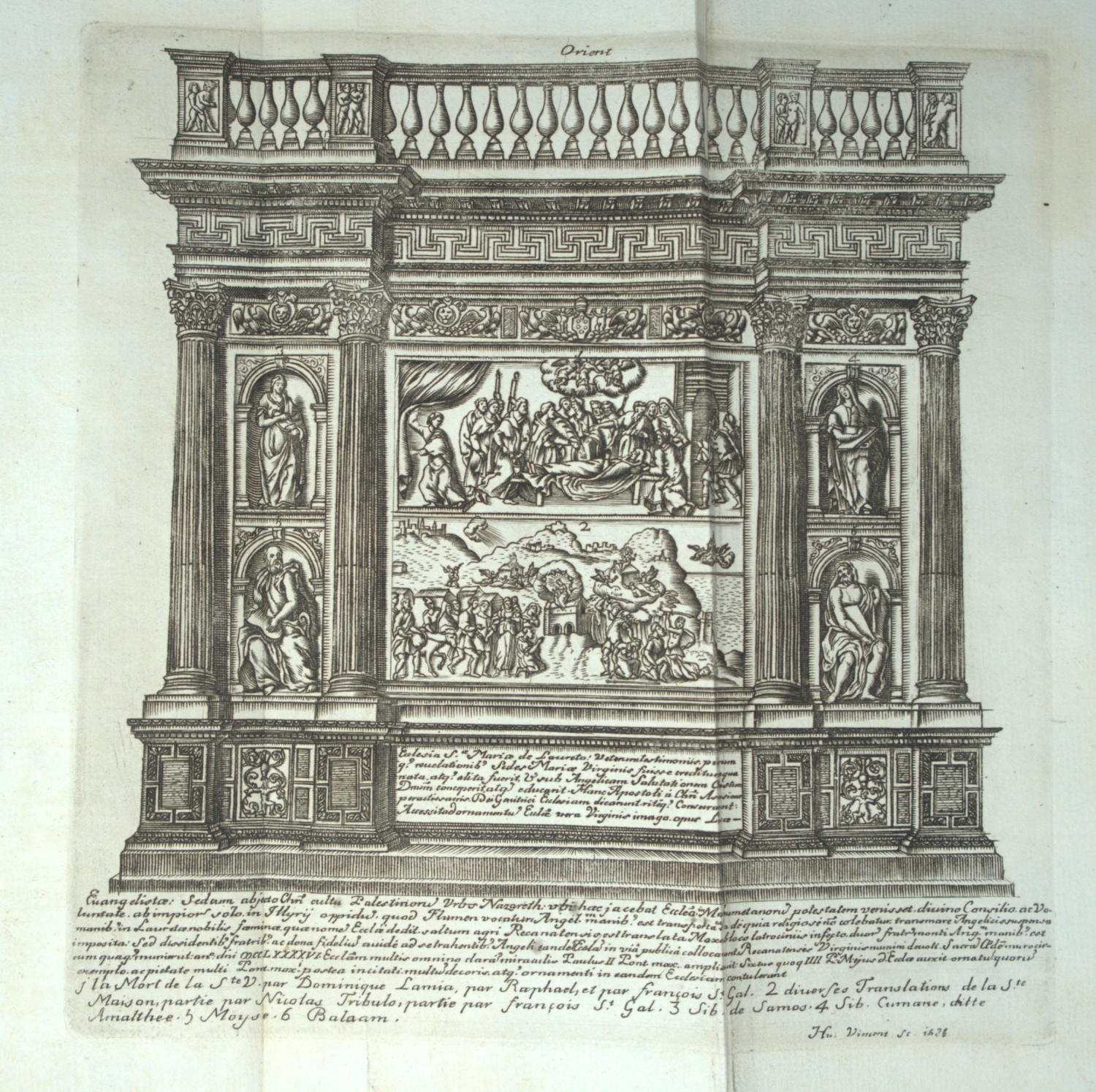 Berliner Ornamentstichkatalog 2674. Nagler XXIII, 33 (datiert 1683). Nicht bei Guilmard. – Nach dem Petersdom in Rom ist Loreto der zweitwichtigste Wallfahrtsort in Italien und einer der wichtigsten der katholischen Welt. Die Basilika vom Heiligen Haus beinhaltet die Santa Casa, der Legende nach das Heilige Haus von Nazaret, in dem Maria aufwuchs und die Verkündigung des Herrn empfing. – Das Erklärungsblatt gebräunt und wasserrandig, alt aufgezogen, die Kupfertafeln bemerkenswert breitrandig.
