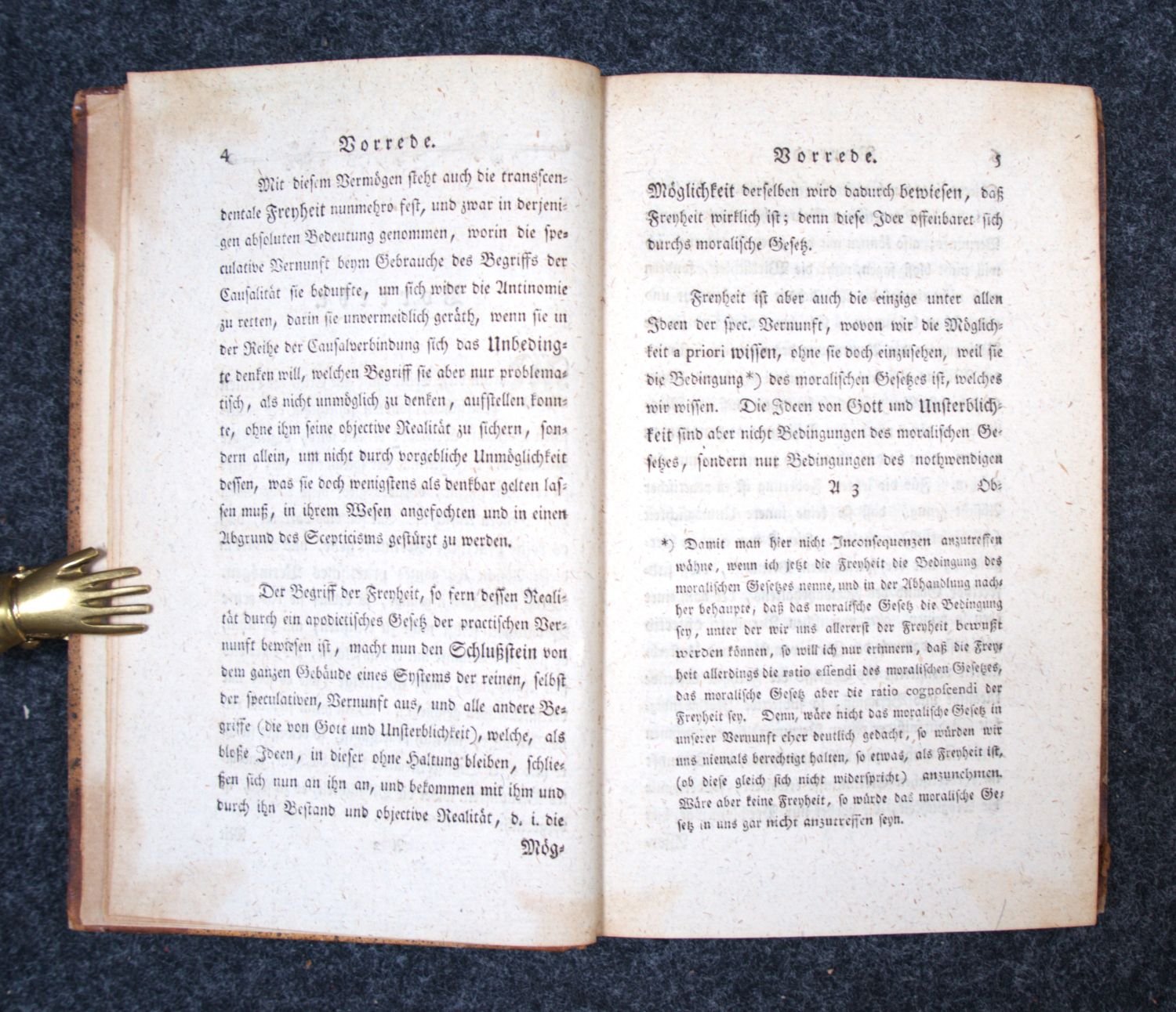Warda 112. Adickes 67. – Erste Ausgabe von Kants zweiter Kritik, die seine Theorie der Moralbegründung enthält. Bis heute eines der wichtigsten Werke der Praktischen Philosophie überhaupt. Mit dem kategorischen Imperativ: "Handle so, daß die Maxime deines Willens jederzeit zugleich als Prinzip einer allgemeinen Gesetzgebung gelten könne." – Etwas stärker leimschattig, sonst schön und wohlerhalten. Innenspiegel mit altem Besitzeintrag.