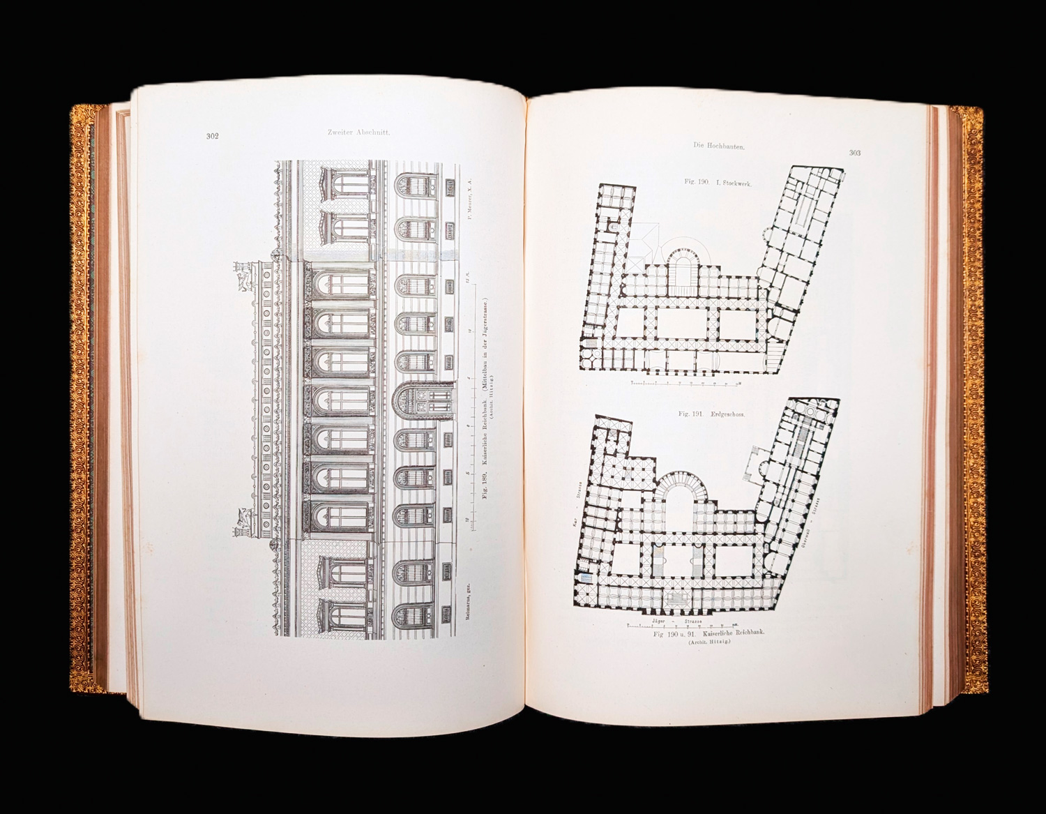Berlin und seine Bauten. Herausgegeben vom Architekten-Verein zu Berlin. 2 Teile in 1 Band. X S., 1 Bl., 487 S.; 301 S. Mit 609 Textholzstichen, 7 gefalteten Karten bzw. Tafeln und mehrfach gefaltetem lithographischem Stadtplan. 26,5 x 18 cm. Reich blind- und goldgeprägtes Leder d. Z. (minimal bestoßen; signiert: "Kgl. Hofbuchbinderei von C. W. Vogt & Sohn") mit goldgeprägtem Rückentitel, goldgeprägten Steh- und Innenkanten sowie Goldschnitt. Berlin 1877.