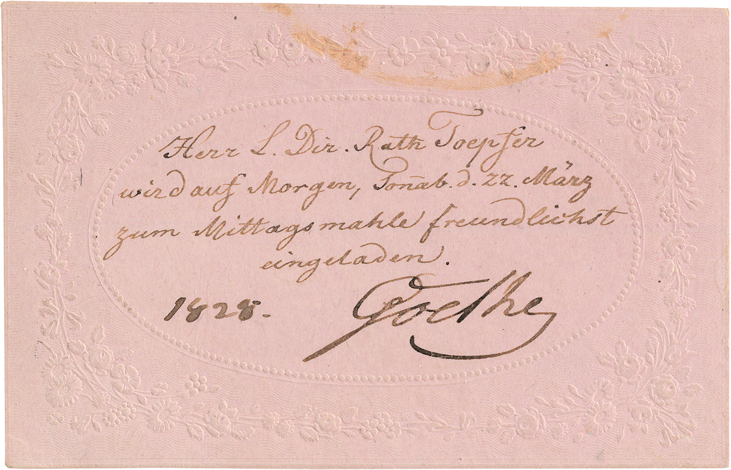 Von Sekretärshand sehr zierlich geschriebene Einladung: "Herr L. Dir. Rath Toepfer wird auf Morgen, Sonnab. d. 22. März zum Mittagsmahle freundlichst eingeladen." Darunter vom Gastgeber geschrieben: "1828. Goethe". - Der Jurist Martin Christian Victor Toepfer war Landesdirektionsrat in Weimar. - Minimal fleckig; rückseitig geringfügige Spuren ehemaliger Montage. - Sehr hübsches Beispiel für den Weimarer Stil der Goethezeit.