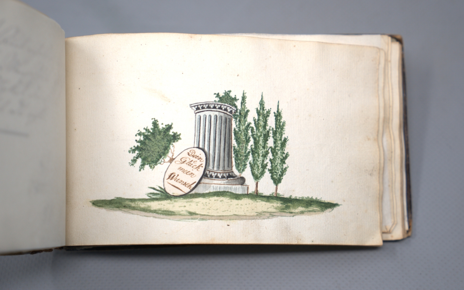 Stammbuch des Carl Felix Colberg aus Magdeburg oder Berlin, wo die Mehrzahl der Verwandten wohnte. Ca. 73 Bl., davon 41 S. beschrieben oder illustriert. Mit 7 aquarellierten Federzeichnungen und 3 kolorierten Kupferstichen. Quer-8vo. Brauner Lederband d. Z. (berieben, das Kapital etwas defekt) mit goldgepr. Bordüren auf beiden Deckeln, Rückenvergoldung mit Rückenschild "Der Freundschaft geweiht" sowie Stehkantenvergoldung und Goldschnitt. 1812-1814.