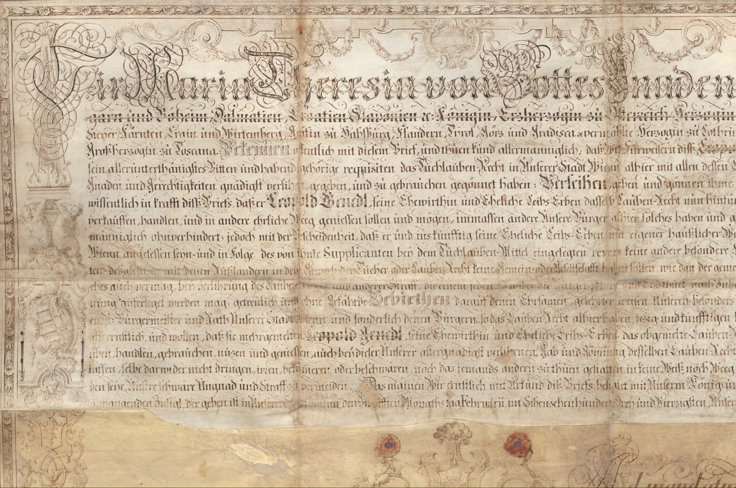 Verleihung des Tuchlauben-Rechtes an Leopold Benedl und seine Erben. Mit Angabe der Bedingungen. Die Kopfzeile sowie die 7-12 cm breiten Ränder mit reicher Ornamentik in Orig.-Federzeichnung gefüllt. - Teilweise angestaubt;die Schrift an einzelnen Stellen beschabt oder verblasst; die Signatur der Kaiserin wohl durch Feuchtigkeit stark ausgeblichen; 3 Löcher in der Plica von der ehem. Befestigung des - fehlenden - Siegels. - Trotz der Erhaltungsmängel eine beeindruckend prächtige Pergament-Urkunde aus der Frühzeit der Regierung Maria Theresias.