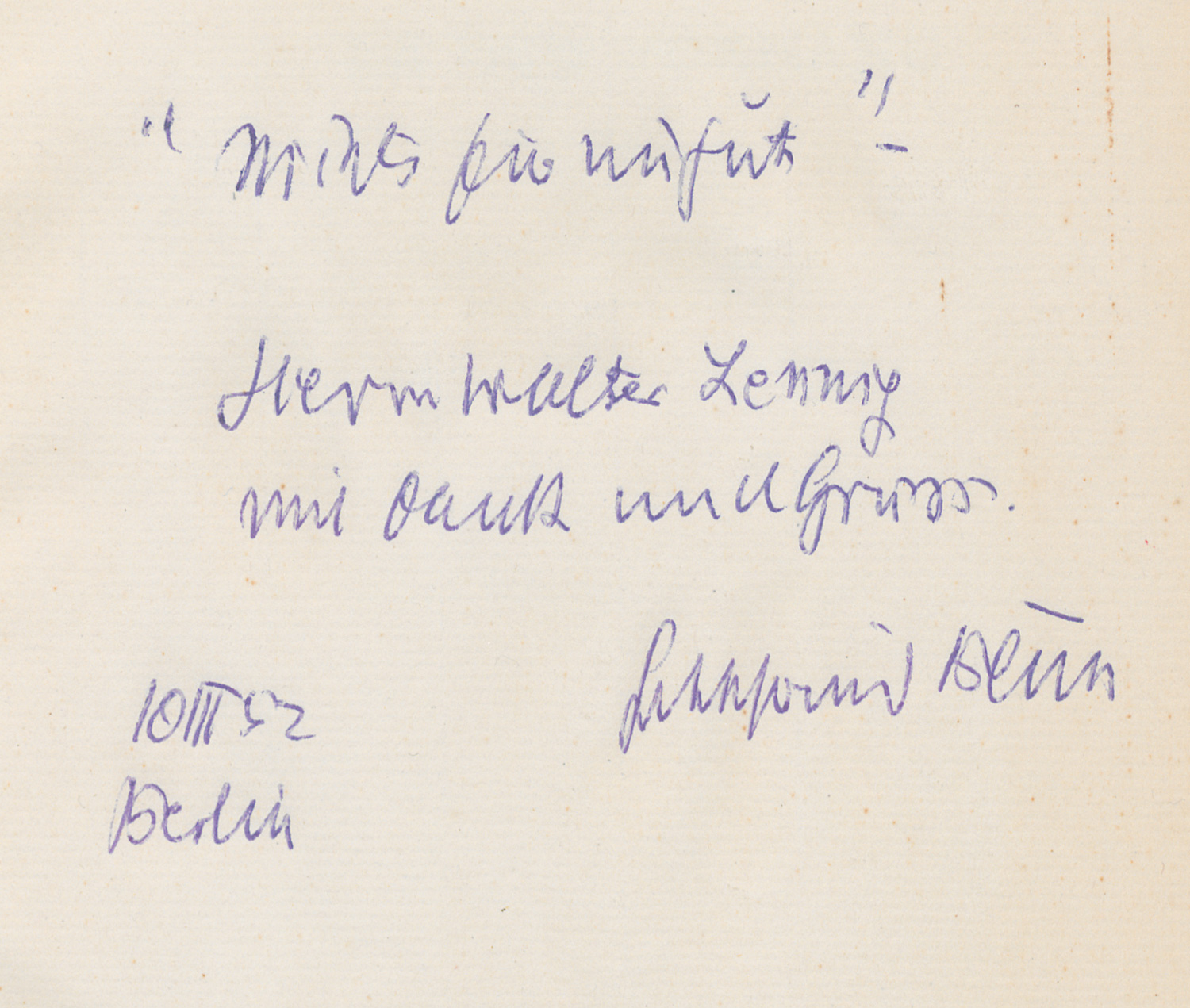 Wilpert-G.2 42. – Erste Ausgabe. Fl. Vorsatz mit Widmung von Gottfried Benn: "'nicht für ungut' - Herrn Walter Lennig mit Dank und Gruss 10 III 52 Berlin - Gottfried Benn".