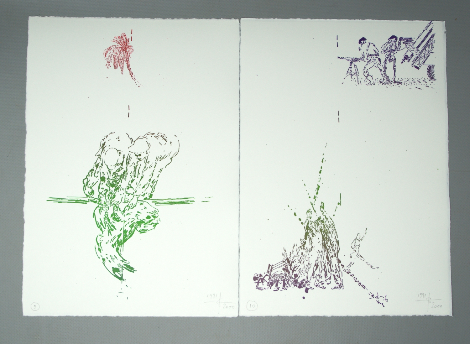 Hafner, Jonas. 24 Bilder während eines Krieges (Umschlagtitel). Mars auf Reisen. Folge von 24 farbigen Lithographien. 29,5 x 21 cm. Lose Blätter in OUmschlag mit hs. Titel und 2 Deckelillustrationen in OHolzschnitt. Hamburg, Edition Griffelkunst, 2000.