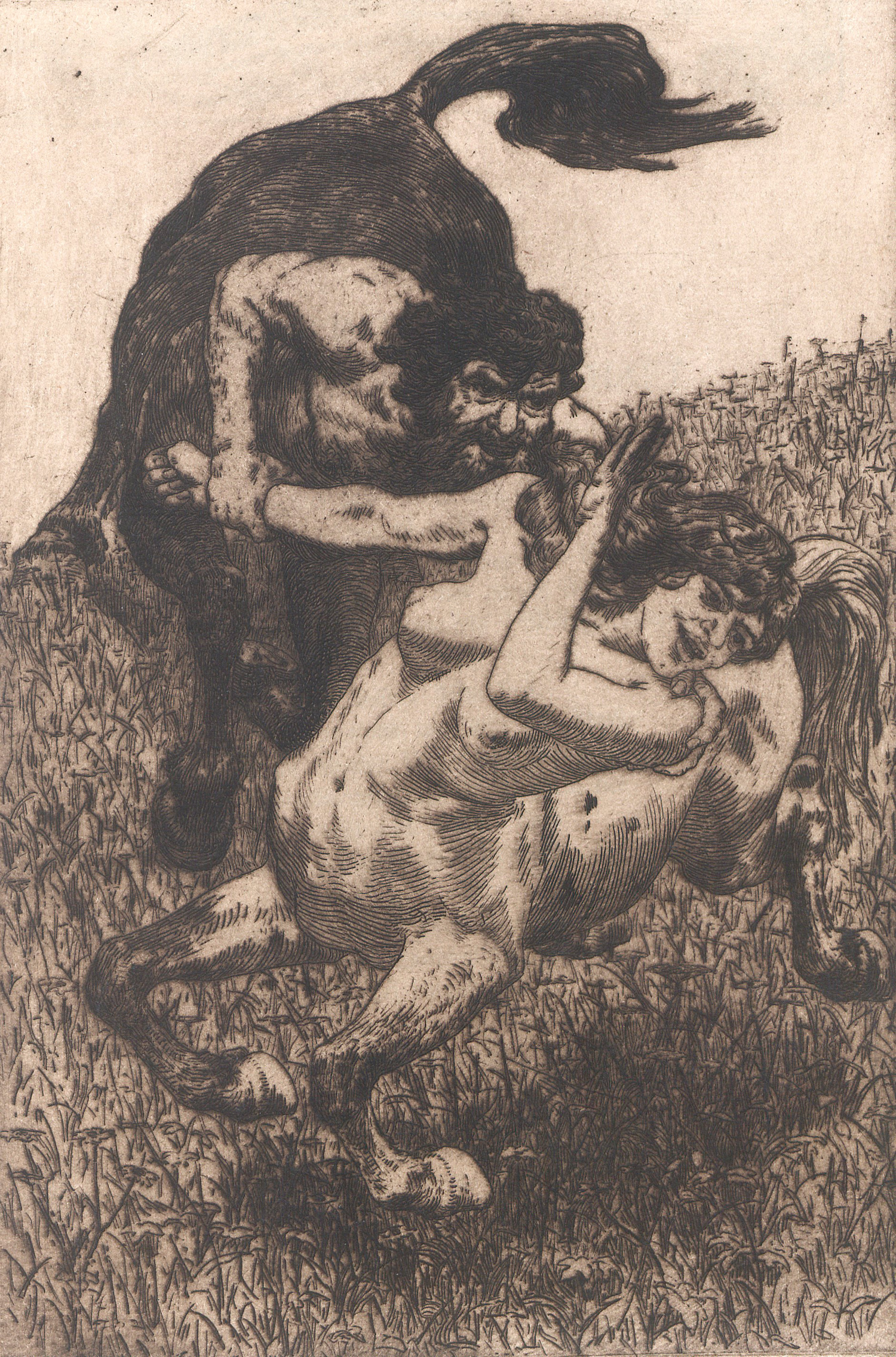 PAN (Vierteljahresschrift). Hrsg. von der Genossenschaft Pan. Heft 1 und 2 des II. Jahrgangs. 2 Bl., 180 S. Mit 8 Original-Radierungen von Max Liebermann, Walter Leistikow, Albert Krüger, Anders Zorn, Charles Maurin, Max Klinger, Otto Fischer, Max Pietschmann, 5 Original-Lithographien von Franz Skarbina, Otto Greiner, Hans Unger, Karl Mediz, Georg Lührig und 1 Original-Holzschnitt von M. Hönemann und mehreren montierten Abbildungen auf Tafeln sowie zahlreichen Abbildungen im Text. 37 x 29 cm. Illustriertes ung goldgeprägtes grünes OLeinen (etwas berieben und bestoßen) mit Rück- und DTitel. Berlin, Fontane & Co., 1896.