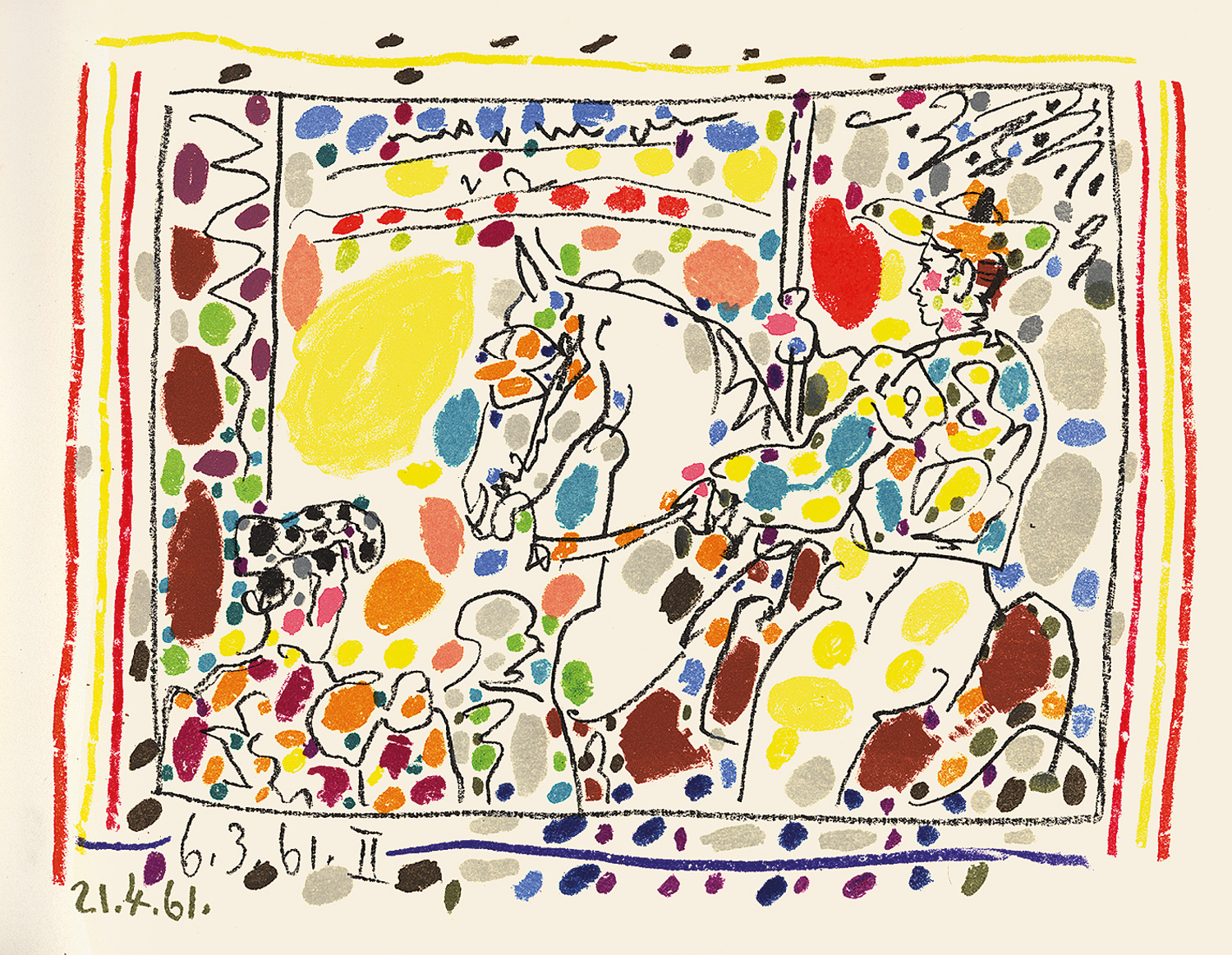 Bloch livres 108. Goeppert-Cramer 113. Mourlot 346 und 348-350. – Erste deutsche Ausgabe. Die vier Original-Lithographien wurden von Picasso eigens für dieses Werk geschaffen und von Mourlot gedruckt: "La Pique" (Bl. 1014), "Jeu de la Cape" (Bl. 1015), "Les Banderilles" (Bl. 1016) und die Farblithographie "Le Picador" (Bl. 1017). – Bemerkenswert schönes, nahezu verlagsfrisches Exemplar.