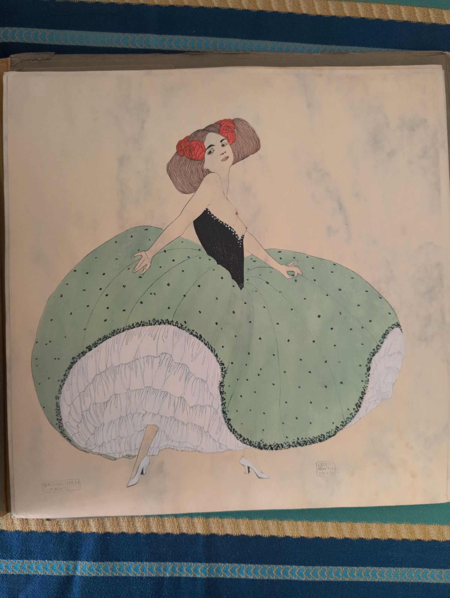 Der Maler und Graphiker Leo Rauth (1884-1913) lehrnte unter anderem bei Franz von Stuck, Ernst Schurth und Waldemar Friedrich. Die Tafeln zeigen wunderschöne Darstellungen verschiedener Tänzer in hübschen Kostümen zum Beispiel: "Bal Masque", "Hollandisch", "Ballgeflüster", "Grinolinen Tanz", "La belle Otero", "Solo-Walzer", "Brand Stiftung" und "Groteske". – Leicht stockfleckig sowie knickpsurig, sonst wohlerhalten. Die Figuren sind in kräftigen farben gehalten.