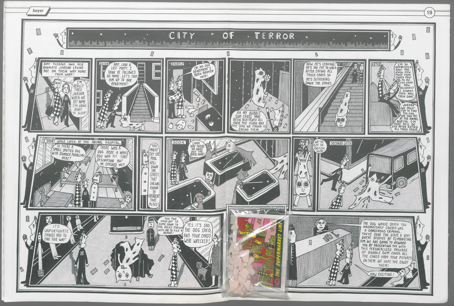 Auf der Innenseite des Rückdeckels montiert: die Einleitung und das erste Kapitel (als "part of a projected 200-250 page work-in-progress") von Art Spiegelmans berühmter Graphic Novel "Maus" (15 S., 18 x 13,5 cm, OBroschur). In der Heftmitte eine kleine Kunststofftüte mit der Karte "The Supermarkt Line" und einer Süßigkeit (in kl. Stücke zerbrochen). – Wohlerhalten.