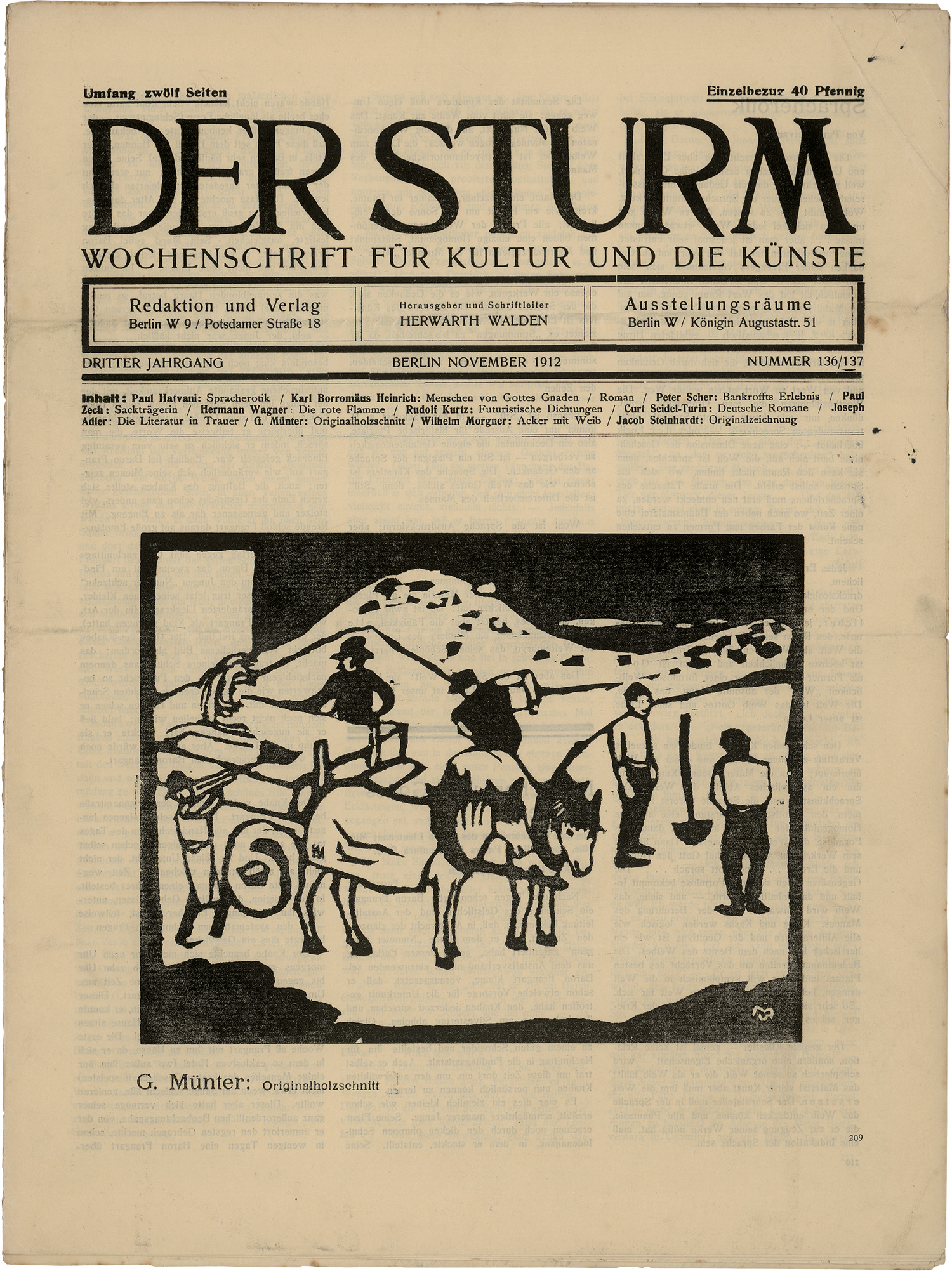 Söhn V, 539ff. – Der vollständige dritte Jahrgang, ab Nummer 129 (15 Hefte) in der besseren Druckvariante auf getöntem Büttenpapier. Mit zahlreichen Erstdrucken des Autors sowie von Benn, Blass, Döblin, Hiller, Franz Jung, Lasker-Schüler, Mynona, Scheerbart und weiteren. – Die ersten 16 Hefte auf normalen Zeitungspapier gedruckt (Bindung abgelöst, lose Lagen) und gebräunt mit kleineren Einrissen. Der Umschlag von Heft 140/141 an der Falz gerissen und teils hinterlegt. Einige der Hefte mittig gefaltet. Ansonsten ab Heft 129 sehr gut erhalten mit nur kleineren Gebrauchsspuren.