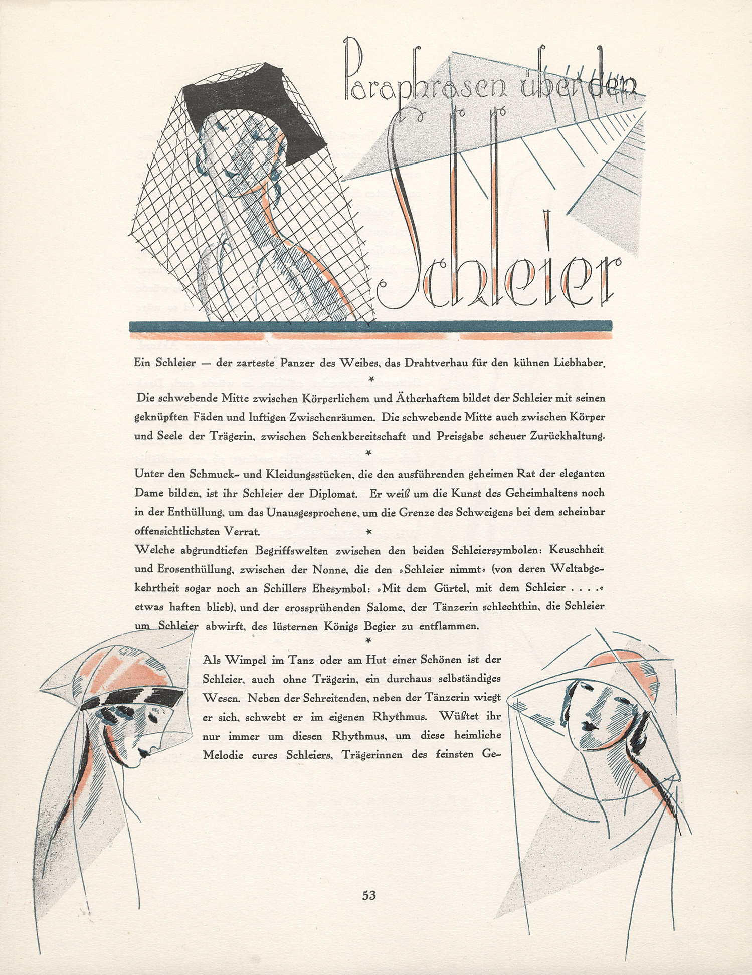 Lipperheide Zb 300. Hiler 822. Laakmann-T. 424. – Erster kompletter Jahrgang der anspruchsvollen Modezeitschrift, mit den schönen Art-Déco Illustrationen. Mit einer Beilage von Modestudien von Anni Offterdinger in Heft 5/6 und einer Beilage mit 9 kolorierten Tafeln in Heft 7. Beteiligte Künstler waren unter anderem L. Kainer, W. Trier, E. Orlik, R. Sintenis. Literarisch beteiligten sich neben anderen K. Edschmid, E. Ludwig, A. R. Meyer und Klabund an der Zeitschrift. – Gut erhalten.