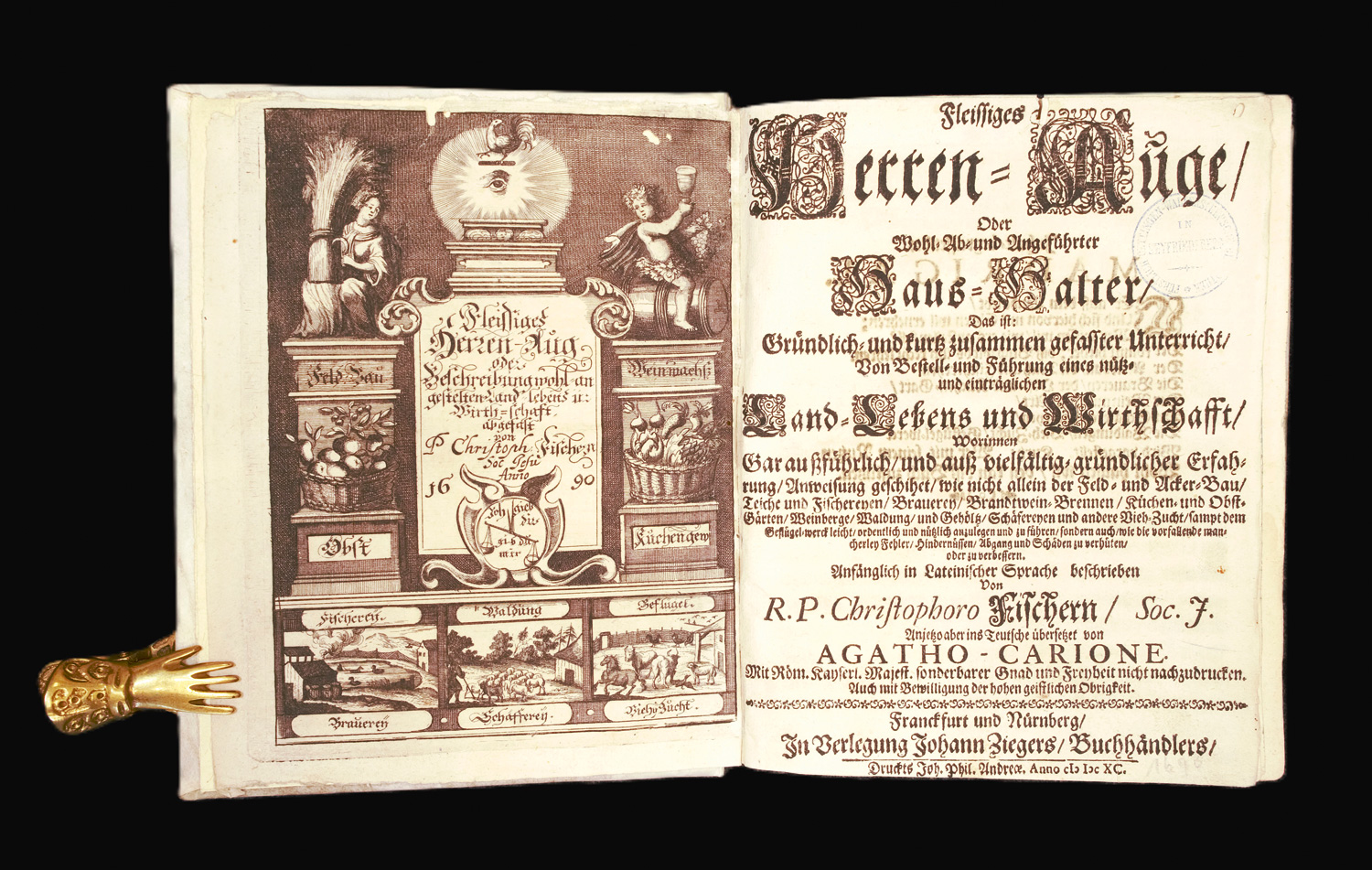 Fischer, Christoph. Fleissiges Herren-Auge, Oder Wohl- Ab- und Angeführter Haus-Halter. 2 Teile in 1 Band. 7 Bl., 296 S.; 3 Bl., 312 S. Mit 2 gestochenen Frontispizen und 12 Textkupfer sowie mehreren Holzschnittvignetten. 20 x 15 cm. Modernes Pergament (etwas fleckig und geworfen). Frankfurt und Nürnberg, Johann Zieger 1690.