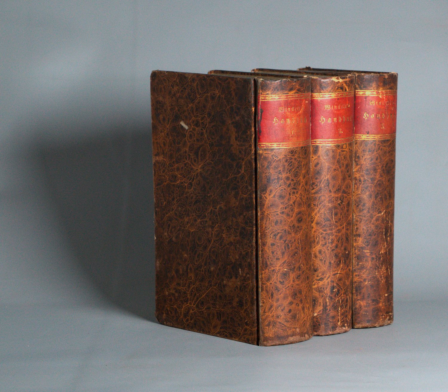 Winckell, Georg Franz Dietrich aus dem. Handbuch für Jäger, Jagdberechtigte und Jagdliebhaber. Zweite vermehrte und ganz umgearbeitete Auflage. 3 Bände. Mit 2 gefalteten Kupfertafeln, 4 gefalteten Tabellen und gefalteter Notentafel. 20 x 12 cm. Marmorierter Pappband d. Z. (etwas berieben) mit goldgeprägtem RSchild. Leipzig, F. A. Brockhaus, 1820-1822.
