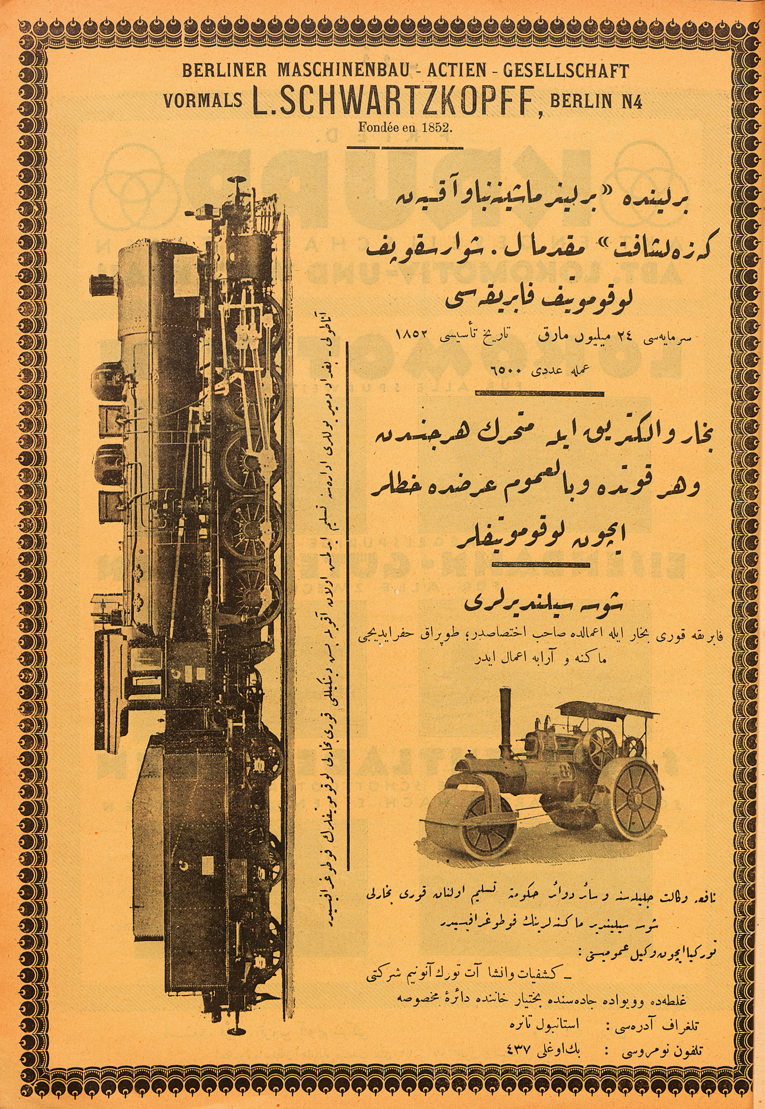 So ist die Zeitschrift eines der letzten Zeugnisse der alten Türkei und auch als Forschungsgrundlage für Linguisten bedeutend, denn sie enthält eine Sammlung von Fachtermini in türkischer, deutscher, englischer und französischer Sprache - nach den Transkriptionen des Türkischen in arabischer Typographie. Nicht zuletzt sind die Werbeanzeigen von Interesse, z. B. der Firma Hugo Stinnes, der AEG, Hannomag, Krupp, der "Orient-Export-Handels-A.-G. Berlin", der "Lokomotivfabrik Krauss & Comp., München" und vielem mehr. – Nur unwesentlich fingerfleckig oder gebräunt, im Block wohlerhalten.