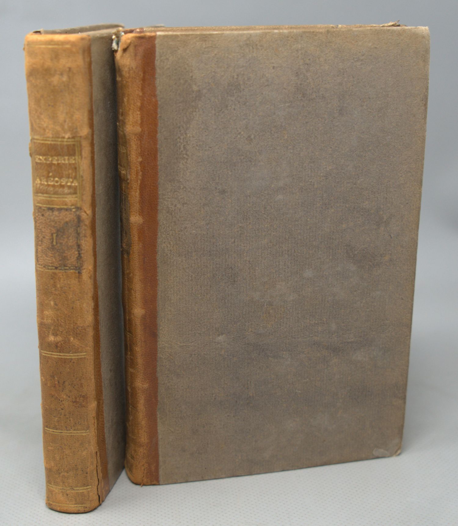 Faujas de Saint-Fond, (B.). Description des expériences de la machine aérostatique de MM. de Montgolfier (avec "Première suite"). 2 Bände. XL, 299 S., 3 Bl.; 1 Bl., 366 (recte 364) S., 1 Bl. Mit 14 Kupfertafeln und Falttabelle. 20 x 13 cm. Halblederbände d. Z. (ein Gelenk angebrochen, Kapital mit leichtem Defekt). Paris, Cuchet, 1783-1784.