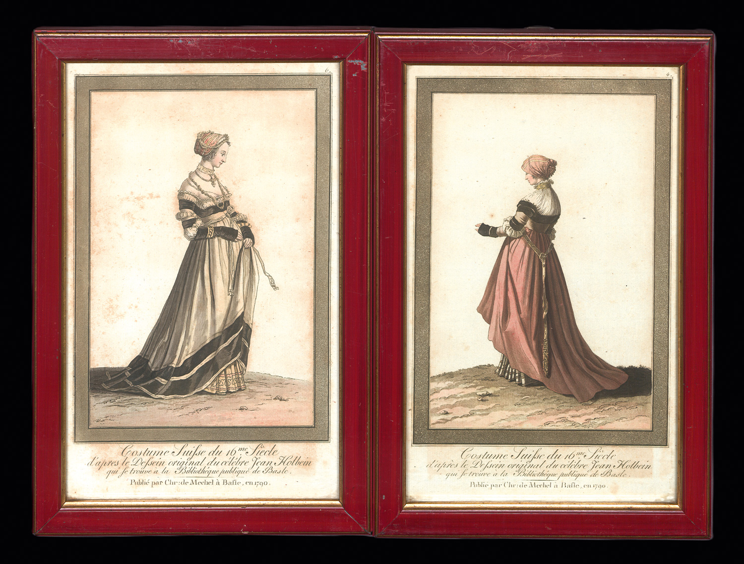 Sehr schöne und seltene Ansichten schweizer Kostüme von Christian Mechel (1737-1817). Dargestellt sind vier weibliche Kostüme von "Luisse" und vier männliche Kostüme von Soldaten, "Jeune Noble" und "Porte-Drapeur". Die vollständige Reihe besteht aus insgesamt zwölf Kupferstichen, je sechs weibliche und sechs männliche Darstellungen. – Papierbedingt gebräunt und etwas stockfleckig sonst gut erhalten. Sehr dekorativ und in feinen pastelligen Farben koloriert. Nicht ausgerahmt, Versand nur ohne Rahmen.