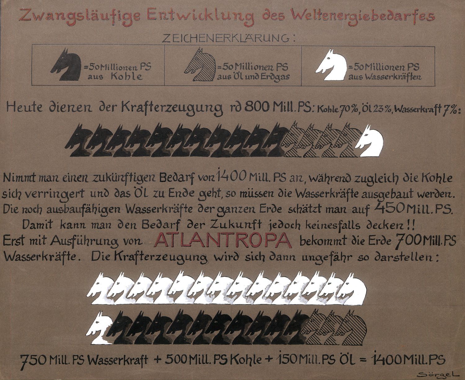 2) Sörgel, Herman. "Zwangsläufige Entwicklung des Weltenergiebedarfes". Original-Schautafel in Tusche und Gouache auf braunem Karton, signiert "Sörgel". 45 x 55 cm. "Erst mit der Ausführung von ATLANTROPA bekommt die Erde 700 Mill. PS Wasserkräfte."