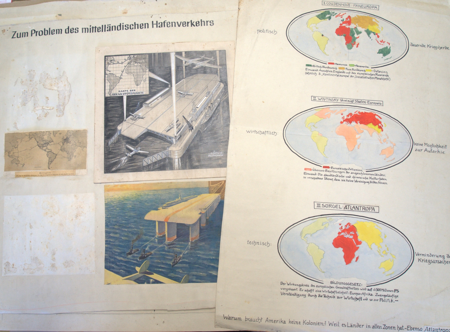 3) "Gegenüberstellung von 3 Wunschbildern, d. Welt zu organisieren." 76 x 46 cm. - Gegenüberstellung der Pläne "I. Coudenhove: Paneuropa", "II. Woytinsky: Vereinigt. Staaten Europas", "III. Sörgel: Atlantropa". Und unten das Resümé: "Warum braucht Amerika keine Kolonien? Weil es Länder in allen Zonen hat. - Ebenso Atlantropa."