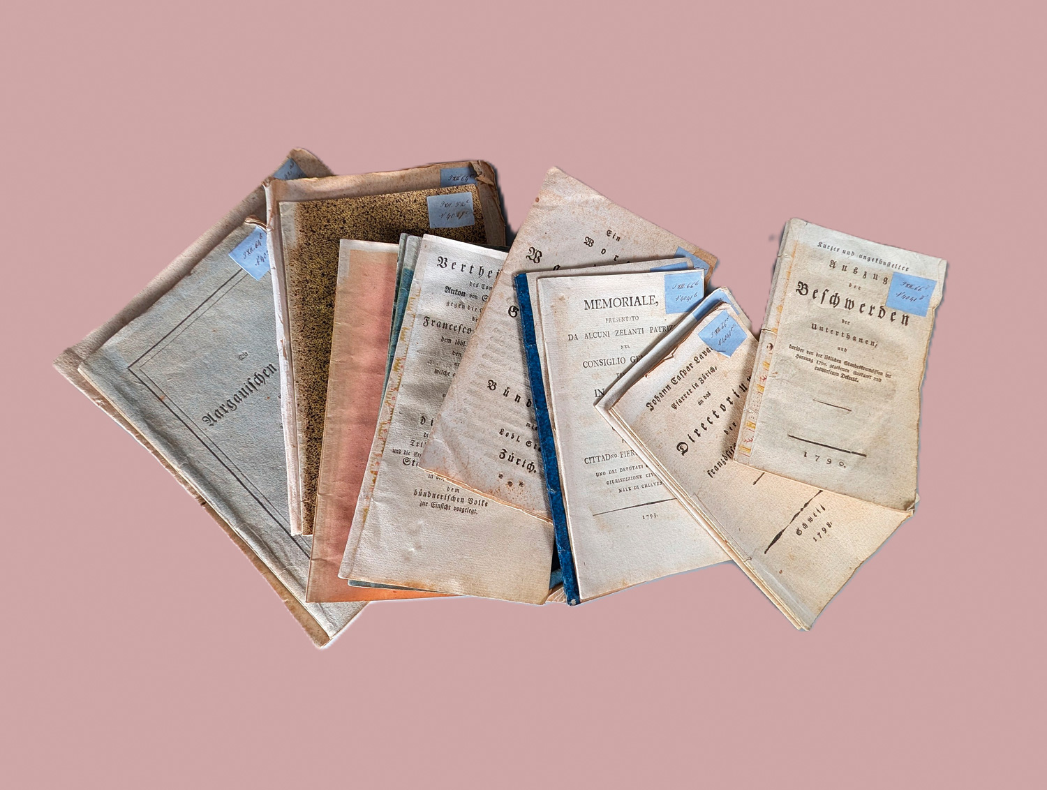 Vorhanden sind: I. Bundes-Brief des Freistaats der drei Bünde, in Rhäzien als die Haupturkunde dessen Verbindungen. 16 S. Chur, Johann Pfeffer, 1790. - II. Kurzer und ungekünstelter Auszug der Beschwerden der Unterthanen, und darüber von der löblichen Standeskomission im Hornung 1790 gegebenen Auskunft und entworfenen Dekrets. 62 S. 1790. - III. Bericht an die Schweizer betreffend ihre Lage in Rücksicht auf ihre Verbindung mit dem König von Frankreich. 27 S. 1792. - IV. Memoriale presentato da Alcuni zelanti patrizij nel consiglio generale tenutosi in Chiavenna. 22 S., 1793. - V.Salis-Solio, Anton von. Vertheidigung des Hrn. Commissars Anton von Salis-Soglio gegen dieEinlage, welche der Notar, Francesco Maria Ferrari dem löbl. Standes-Tribunale den 23.sten Jul. 1794 eingereicht haben soll ... 1794. - VI. Baron von Cronthal. Gerechte Beschwerde über die vielfältigen Uebertrettungen des allgemeinen Bundsbriefs, der Erdeinigung, desewigen Friedens, Capitulate und Tracteten, und Kränkungen der Rechte der Herrschaft Razins ... 51 S. 1795. - VII. Ein Wort der Warnung an alle rechtschafne Graubündtner über den Bruch der Bündnisses mit lobl. Stand Zürich. O. J. (1796). - VIII. Johann Caspar Lavater, Pfarrer in Zürich, an das Directorium der französischen Republik. 32 S. Schweiz 1798. - IX. Ansprüche und Hoffnungen der Stadt Trier, bei Gelegenheit der Organisation des königl. preussischen Großherzogthums Nieder-Rhein. 20 S. Trier, Heßrodt, 1815. - X. Actenstücke, die am 12. und 20. März 1822 zu Kreuznach stattgehabten Verhaftungen betreffend. Zweite Lieferung. VI, Seite 29-72. Koblenz, Heriot, 1822. - XII. F. C. Grimmel. Etwas über J. P. Klingenschmidt, gestorben zu Kreuznach am 28. März 1822. 1 Bl., 20 S. Koblenz, B. Heriot, 1822. - XIII. Johann Heinrich Kaufmann. Denkschrift bei der freudigen Heimkehr der Herren C. Eberts und W. Schneegans, Superintendenten der evangelischen Gemeinde von Kreuznach. 22 S., 1 Bl. Mainz, Florian Kupferberg, 1822. - XIV. Ludwig Christian Kehr. Denkschrift bei der freudigen Heimkehr des Herrn Dr. Carl Grimmel und des Herrn Notar Born. 24 S. Mainz, Florian Kupferberg, 1822. - XV. Der Verfassungsrath des Kantons St. Gallen und der Fürst-Bischof von St. Gallen. 16 S. St. Gallen, Wegelin und Wartmann, 1831. - XVI. Die Aargausichen Klöster und ihre Ankläger. Auszug aus der Denkschrift. 100 S. Schaffhausen, Hurter, 1841.