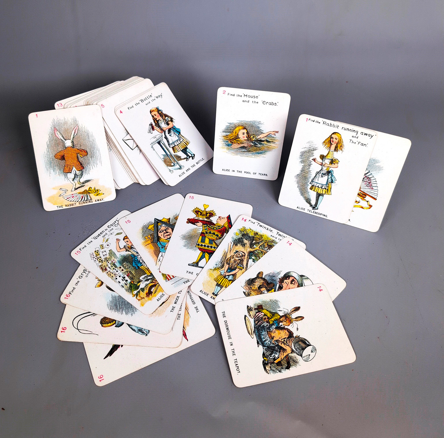 The pictorial game of "Alice in Wonderland" from the Original Designs. 48 kolorierte und illustrierte Karten nach Sir John Tenniel von E. Gertrude Thomson. 9 x 6,5 cm. Rosaner, illustrierter Pappschuber (berieben, bestoßen, teils mit kleinen Einrissen und kleiner Fehlstelle). London, Thomas de la Rue & Co., o. J. (um 1905).