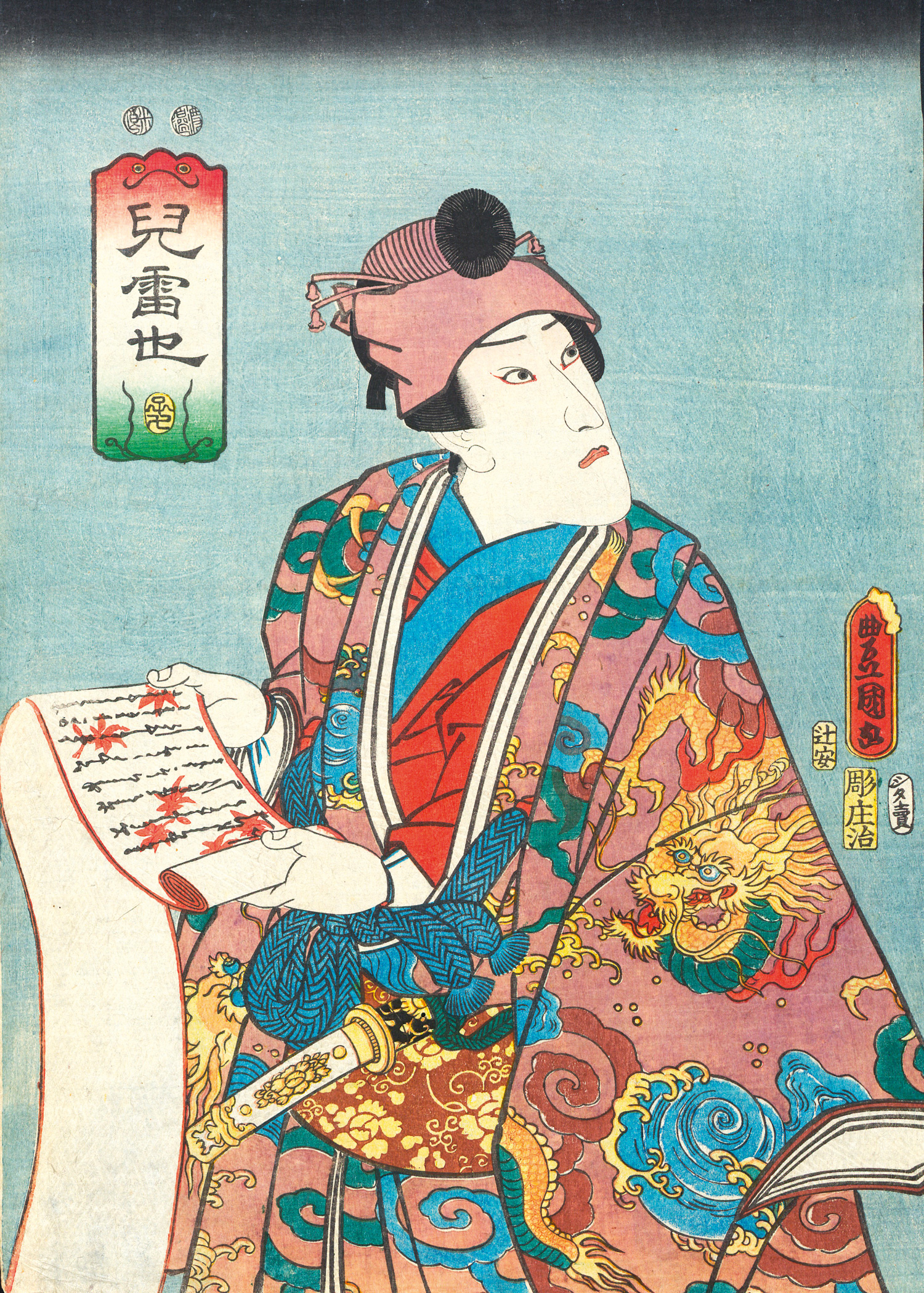 II. Ichikawa Danjuro VIII in der Rolle des Jiraya, Meister der Froschmagie, Serie Jiraya, Verlag Tsuji-ya Yasubei, 1852. – Position I in beiden oberen Ecken leicht leimspurig. Position II mit einem winzigen Einstich. Insgesamt von sehr guter Erhaltung und überaus farbfrisch.