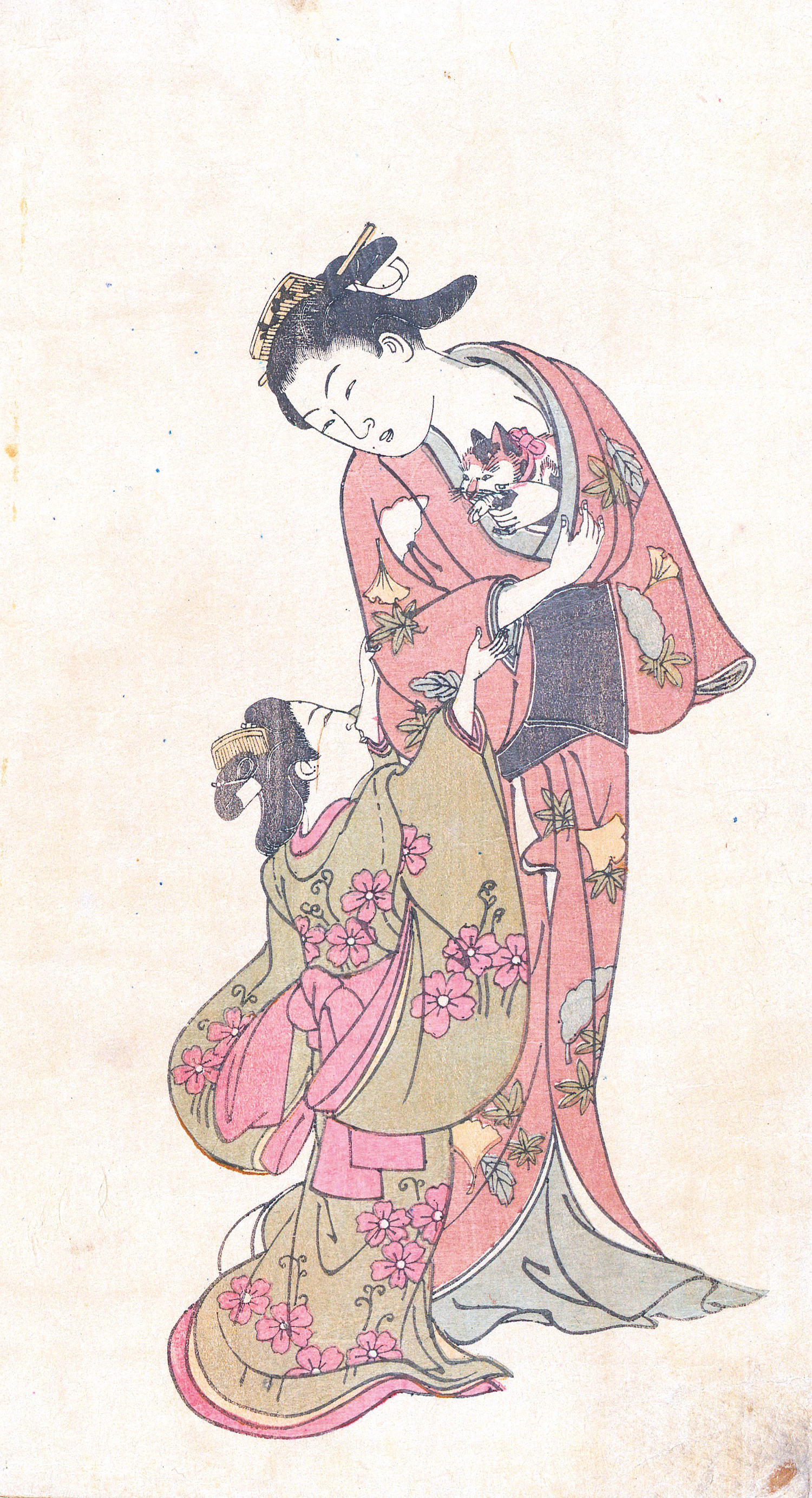 Sieben reizenden Farbholzschnitte des eher selten im Handel auftauchenden Ukiyo-e Künstlers Nishikawa Sukenobu (1671-1750), der vor allem für seine Serien von Bijin, anmutigen Frauen in traditionellen Gewändern bekannt war, die teils in Büchern (Ehon = illustrierte Bücher) veröffentlicht wurden. Hier handelt es sich aber wohl um eigenständige Blätter ohne textlichen Kontext. Der Hügel Asaka (Asakayama) ist eine Erhebung im heutigen öffentlichen Park im Bezirk Kita (Tokio), der bekannt war für seine flanierenden schönen Damen. – Kaum und nur vereinzelt minimal fleckig, geringe Gebrauchsspuren, leicht angestaubt. Sehr hübsche Bildergalerie.
