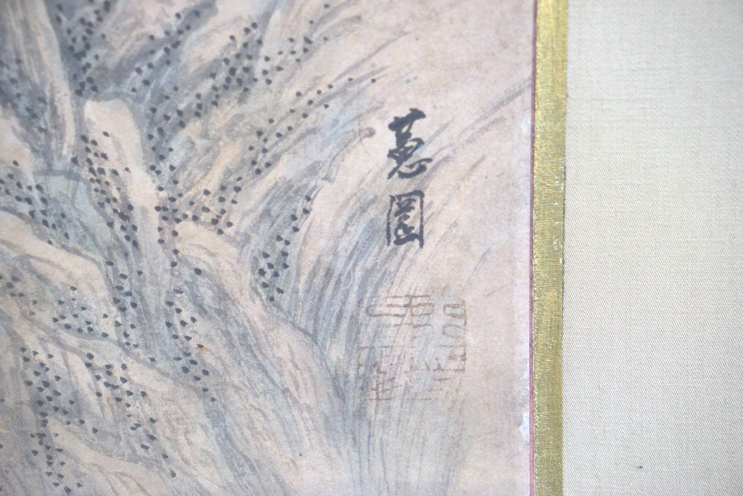 In der chinesischen Tuschmalerei "Shuimo Hua" ist das am höchsten geschätzte Sujet die Landschaft, meist bizarre Bergwelten mit mächtigen Bäumen, mit Wasserfällen, Seen und Flüssen, die enge Schluchten durchschneiden. Figürliche Zusätze bilden meistens nur Staffagen, auch wenn sie oft titelgebend sind. Alles genannten Elemente finden sich hier: Die dargestellte Berglandschaft wirkt auch daher so gewaltig, weil die Staffagen, ein winziges Segelboot, kleine Häuser am Ufer, aber auch die Weiqi-Spieler im Bildmittelgrund eine Relation herstellen. Unten erscheinen zwei Landarbeiter, wohl damit beschäftigt, Reis zu dreschen, während auf einer Bergwiese zwei Spieler das berühmte Weiqi- bzw. Go-Brettspiel spielen, während zwei Zuschauer, einer mit langer Pfeife, ihnen Gesellschaft leisten. – Mehrere, jedoch meist nur kleinere Flecke, hier und da Oberflächenbereibungen, allenthalber kleine Randläsuren, fest auf Kartonpappe montiert, sehr dekorativ und kontemplativ. - Schön gerahmt, nicht ausgerahmt, Versand jedoch nur ohne Rahmen.