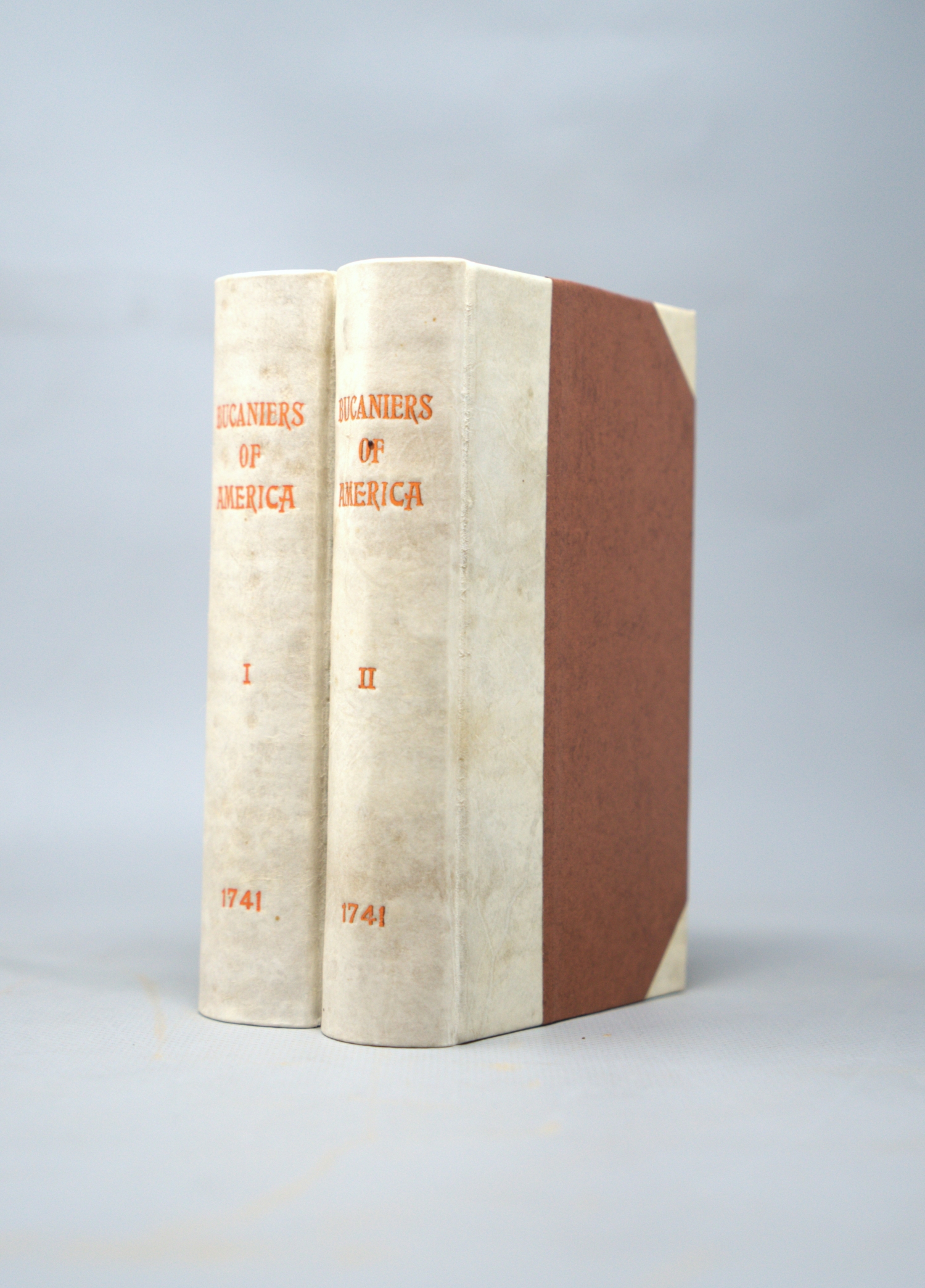 (Exquemelin, Alexandre Olivier). The History of the Bucaniers of America. Translated into English. The 4th edition. 2 Bände. 3 Bl., 354 S., 23 S.; 1 Bl., 406 S., 12 Bl. Mit 2 gestochenen Frontispices, 5 teils gefalteten Kupfertafeln und 2 gefalteten Kupferkarten. 16 x 9 cm. Modernes Halbpergament mit RTitel. London, D. Midwinter u. a., 1741.