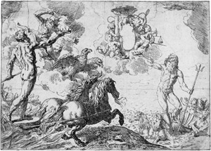 Jupiter, Neptun und Pluto bieten ihre Kronen dem Wappen des Kardinals Borghese an (Le Quos ego). Radierung. 30,3 x 43,1 cm. B. XIX, S. 139, 29 II. Wz. Anker im Kreis.