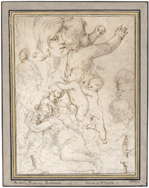 Andrea Podestà war 1627 in der Werkstatt von Giovanni Battista Paggi tätig, zuvor arbeitete er mit Giovanni Andrea de Ferrari in Genua. Zentrum des Patronats im 17. Jahrhundert war Rom und Podestà , der heute vor allem als Radierer bekannt ist, arbeitete dort als Maler für den Diplomaten und Gelehrten Cassiano del Pozzo und den Herzog von Bracciano Giordano Orsini. Motivisch zeigt Podestà gerne Putti oder Knäblein, spielend und ausgelassen. Unsere Studie zeichnet sich durch eine lebendige Linie und die geistreiche Gegenüberstellung von Figuren aus. Mary Newcome bestätigte mündlich die Zuschreibung an Giovanni Andrea Podestà.- Auf einem alten Sammlerkarton montiert.