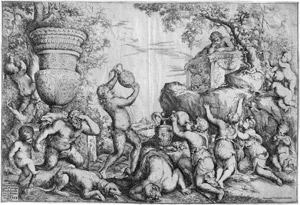 Bacchanal mit trunkenen Satyrn und Kindern. Radierung. 26,3 x 39,2 cm. 1640. B. XX, S. 171, 4, TIB (Commentary) .004 S1 (von S3). Wz. Initialen im Oval.