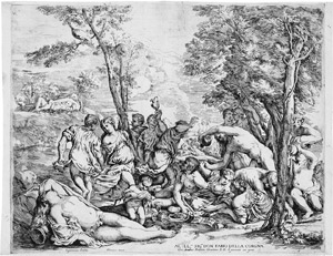 Das Blatt ist Paolo Giordano Orsini zugeeignet. Ganz ausgezeichneter, herrlich differenzierter Frühdruck. Vor Änderung der Jahreszahl von 1640 zu 1649 sowie noch mit der Adresse von Francesco Salucio rechts unten. Überwiegend an die Einfassungslinie geschnitten, rechts partiell knapp innerhalb dieser. Verso schwache geglättete Mittelfalte, dort verso punktuell ausgebessert, an den Weinbehältern rechts unten sowie am Grab oben kleine Ausbesserung mit unmerklicher Federretusche, vereinzelt leicht fleckig, weitere geringe Gebrauchsspuren, sonst sehr gut erhalten. Selten.