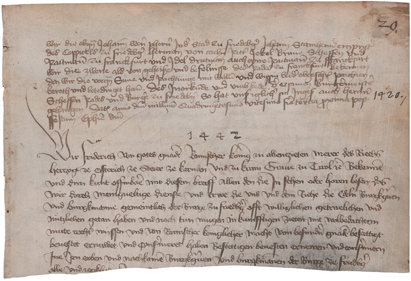 Fragment einer Kopiars mit Abschriften zweier Urkunden. Friedberg in Hessen Mitte 15. Jahrhundert (nach 1442). - Abschriften von Urkunden König Friedrichs IV