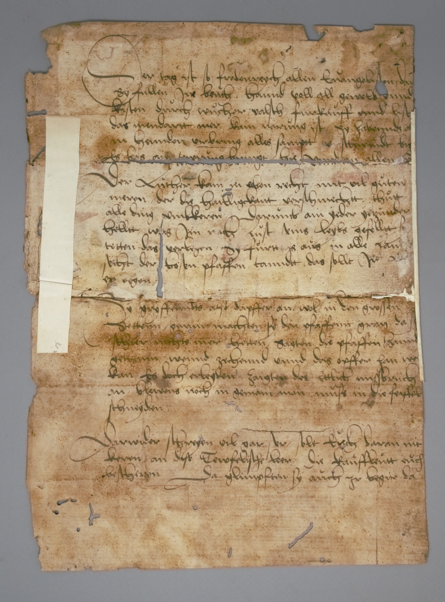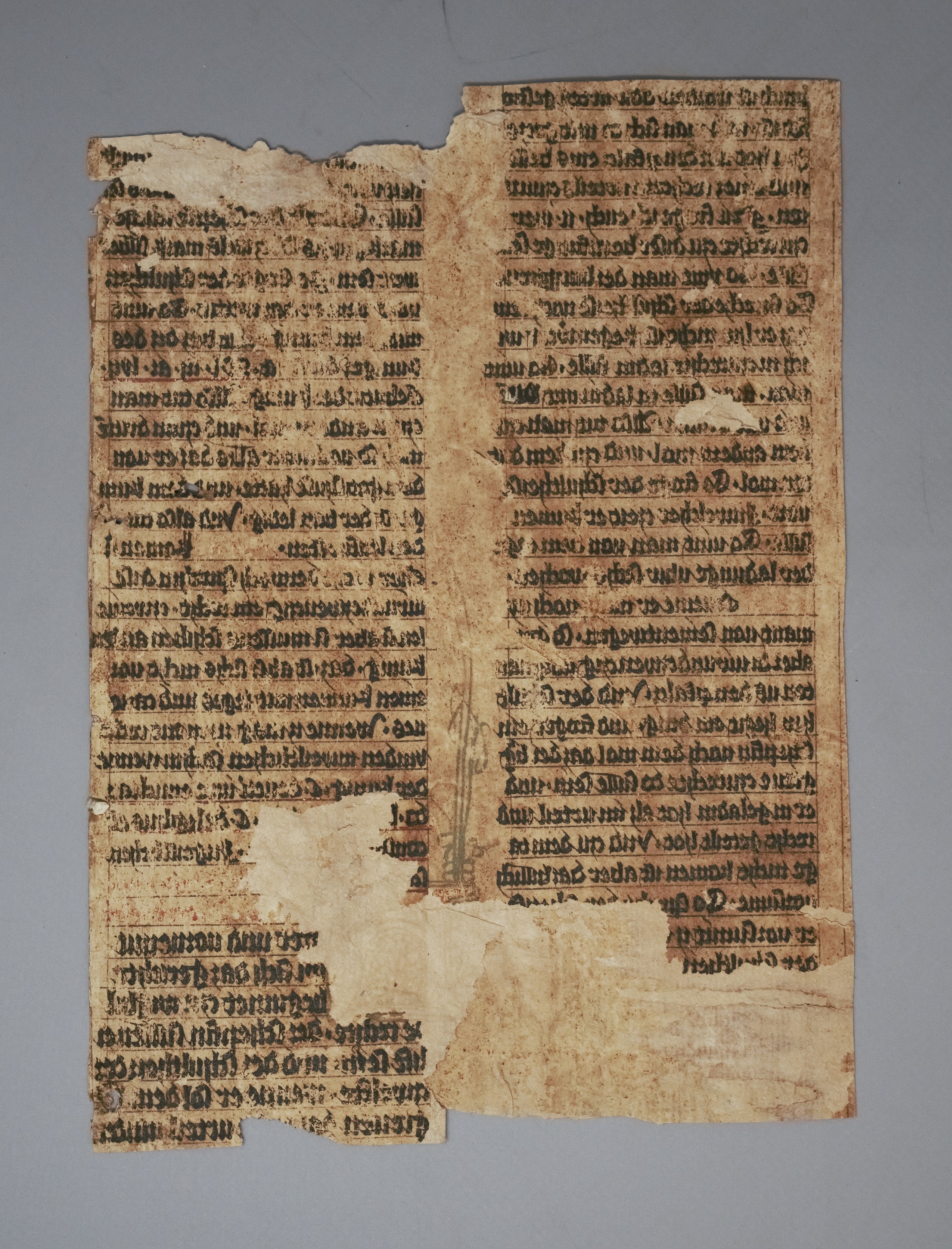 Zwei Fragmente einer hoch- bzw. frühspätmittelalterlichen Handschrift aus dem Magdeburger Stadtrecht mit Glossen, erhalten als spiegelverkehrter Abklatsch auf verleimtem Trägerpapier aus Karton. Vorhanden sind Fragmente von jeweils zwei Kolumnen in einer sauberen regelmäßigen Gotica textura. Identifiziert hat die Fragmente der Heidelberger Germanist und Mediävist Gerhard Eis (1908-1982). – Rote Tinte meist verblasst, bzw. unlesbar, da nicht auf das Trägerpapier mitübertragen, Aus- und Einbrüche, Textverluste - ein mittelalterliches Kuriosum. – Beiliegen: 2 weitere Blätter einer Handschrift aus der 2. Hälfte des 16. Jahrhunderts, möglicherweise aus der Handschrift, in deren Deckeln die beiden Spiegelfragmente stammen.