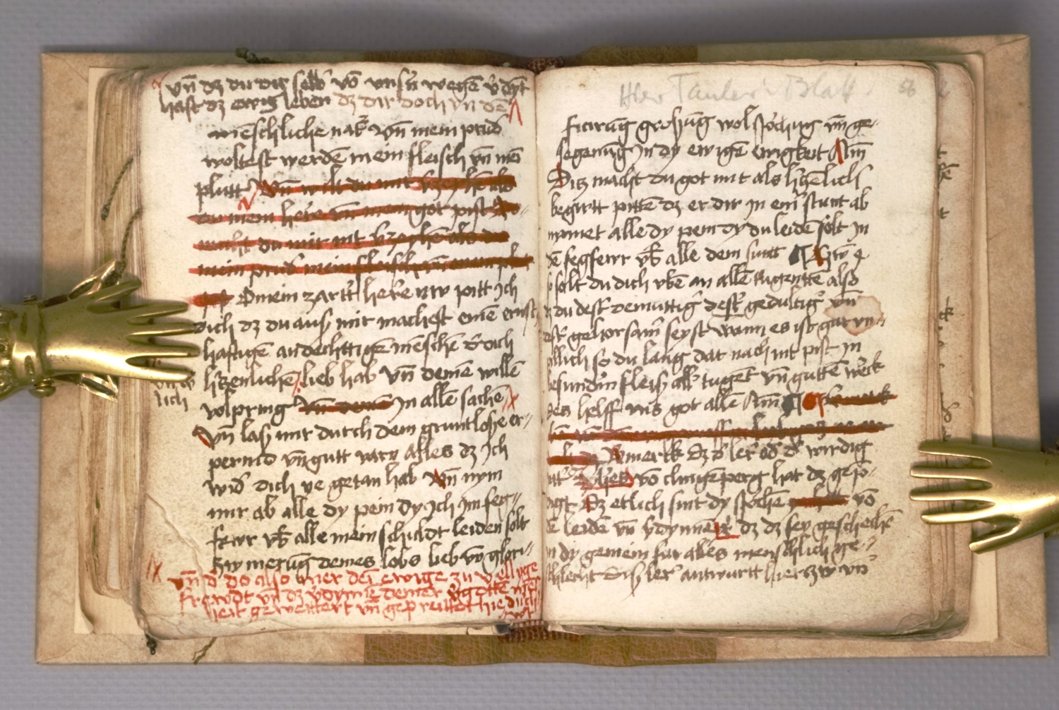Die letzten vier Lagen (80 Bl.) wurden von Gerhard Eis aus der Handschrift herausgenommen und bilden seitdem Hs. 115 in der Sammlung Eis. Zwei Lagen (23 Bl.) nach Bl. 142 wurden von Eis ebenfalls aus der Handschrift herausgenommen und separat gebunden; sie bilden jetzt Hs. 116. – Sehr gut erhalten, mit wenigen zeitgenössischen Korrekturen, teils mit kleinen Papierauflagen mit Verbesserungen, Ränder minimal brüchig, nur vereinzelt etwas gebräunt. Mit vier hübschen farbigen, an die Blätter geknüpften Lesezeichen-Litzen.