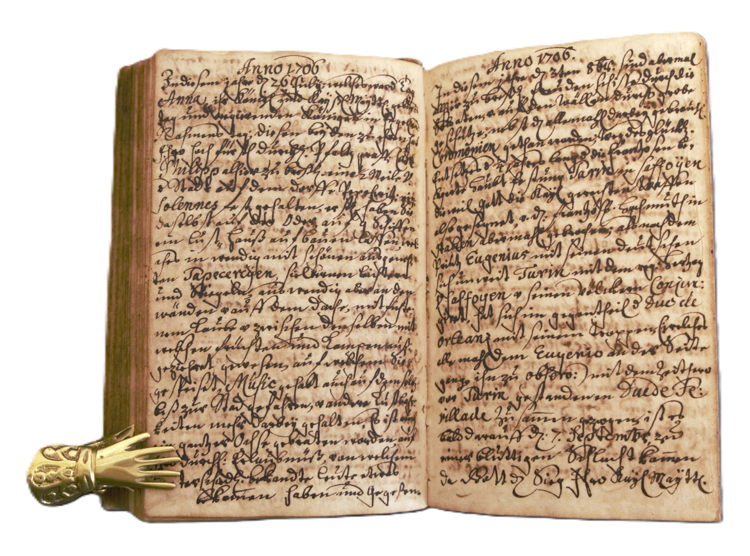 "Breßlauer Tage Buch oder Beschreibung derer Geschichte. Welche sich von Erbauung der Stadt Breßlau in unterschiedlichen Zeiten und Orten begeben hat. Wie auch allerhandt Merkwürdigen Sachen. Beschrieben per Anonimum Anno 1707 adj. Primo July Wie es demselben durch seinen gutten Freundt ist Communiciret worden." Deutsche Handschrift in schwarzbrauner Sepiatinte auf Papier. 159 Bl., davon 147 beschrieben. Schriftraum ca. 15 x 10. Format 17 x 10,5 cm. Etwas späterer marmorierter Pappband (berieben). Breslau 1707-1711.