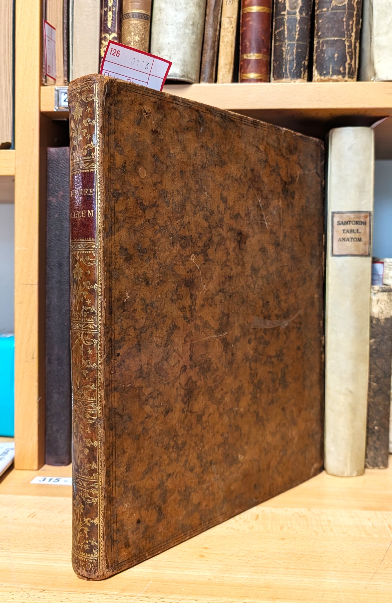 Julien, R(och-)J(oseph). Atlas topographique et militaire qui comprend le royaume de Bohême, les marquisats de Moravie et de Lusace, le duché de Silésie, la haute et basse Saxe, les frontières du haut Rhin et de Westphalie, et les cartes générales de ces états et du théatre de la guerre présenté en Allemagne. 2 (1 doppelblattgroß) Kupfertitel, gestochene Übersichtskarte, gestochene Legende mit 63 (60 grenz-, 2 teilkolorierten) teils gefalteten Kupferkarten und 1 mehrfach gefalteter Plan. 33 x 25,5 cm. Wurzelmarmoriertes Leder d. Z. (bestoßen, Deckel mit kleineren Fehlstellen) mit goldgeprägtem RSchild und floraler RVergoldung. Paris, Selbstverlag, 1758.